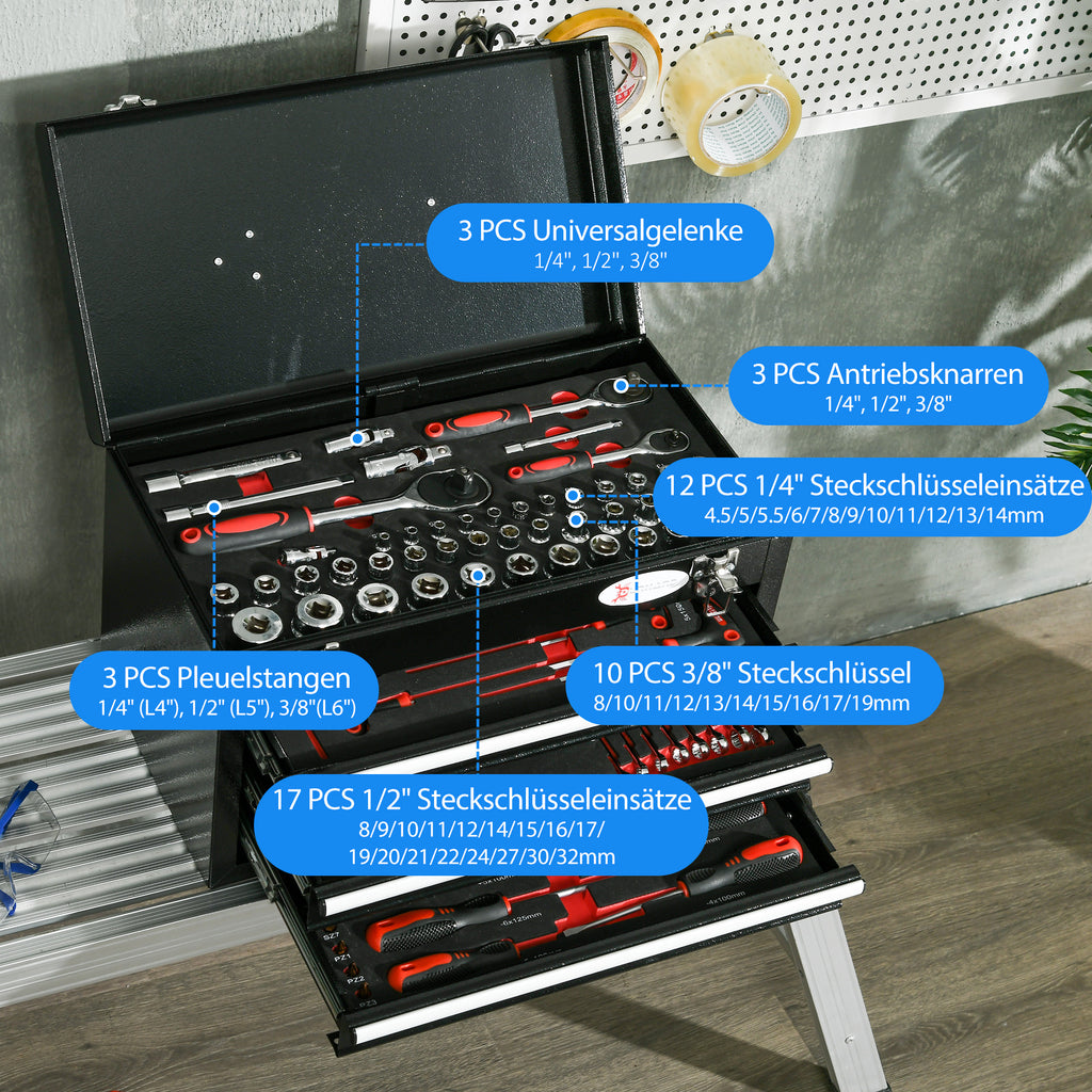- Steckschlüssel in den Größen 1/4 Zoll, 3/8 Zoll und 1/2 Zoll mit Ratschen, Gelenken und Verbindungsstangen