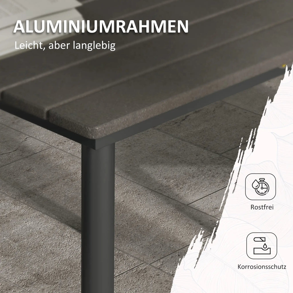 Bringen Sie Familie und Freunde mit diesem Outsunny Gartentisch für 4 Personen zusammen. Der Tisch ist langlebig und pflegeleicht, da er aus einem pulverbeschichteten Metallgestell und einer HDPE-Platte besteht. Die Reinigung ist mit einem feuchten Tuch ein Kinderspiel. So haben Sie mehr Zeit, Ihre Aktivitäten im Freien zu genießen. Dank des Sonnenschirmlochs können Sie Ihren Lieblingsschirm aufstellen und sich vor der Sonne schützen.