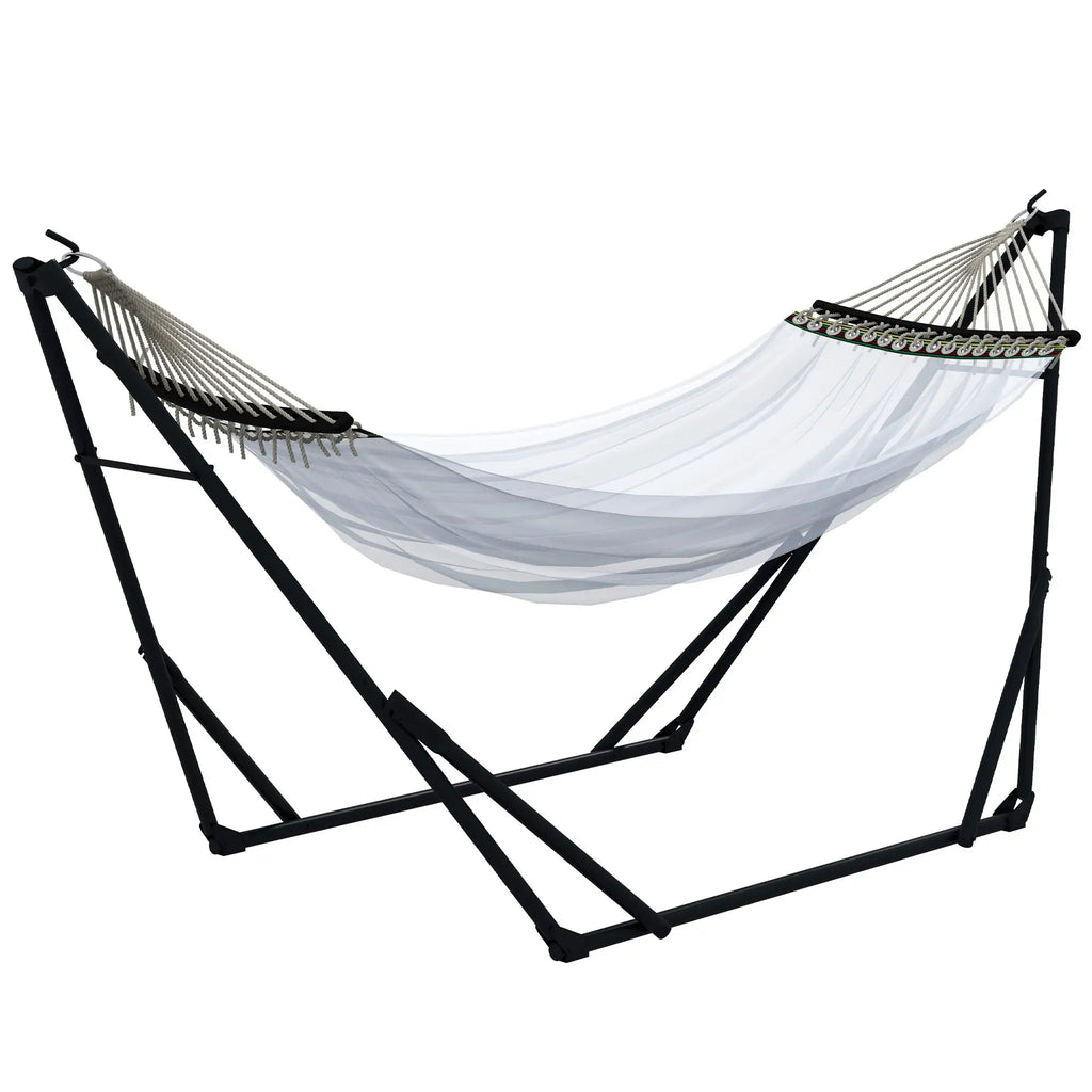Mit diesem Hängemattenständer von Outsunny können Sie Ihre Hängematte überall aufhängen, ohne einen Baum zu benötigen. Das Gestell ist aus pulverbeschichtetem Stahl gefertigt und somit besonders stabil und langlebig. Dieses 2-in-1-Design lässt sich leicht in einen Hängemattennetzständer und einen Hängestuhlständer verwandeln. Das faltbare Design mit Tragetasche erleichtert die Lagerung und den Transport. Entspannen Sie sich mit einer Hängematte aus Nylon. Die Hängematte ist sicher, stabil und wetterbeständig. Sie kann das ganze Jahr über im Freien verwendet werden.