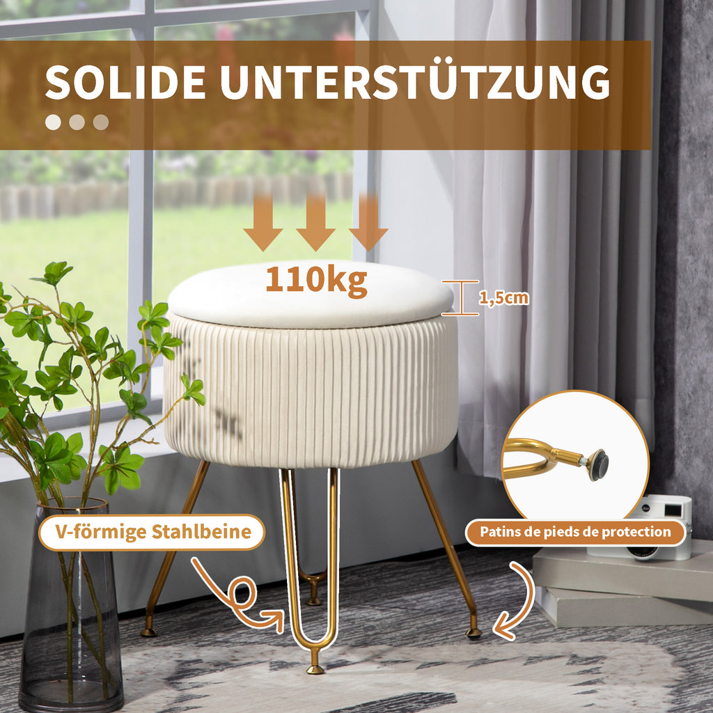 Entdecken Sie die Vorzüge des HOMCOM Sitzhockers mit Stauraum. Unter dem gepolsterten Deckel des Sitzhockers verbirgt sich ein 13,5 L Stauraum und ein einfacher Klappmechanismus verwandelt ihn vom Fußhocker in einen eleganten Beistelltisch für Getränke. Das mit samtartigem Stoff bezogene, gepolsterte Oberteil ruht auf schlanken Metallbeinen. Dieses stilvolle Hocker ist ideal dafür geeignet, um Ordnung in Ihren Wohnbereich zu bringen und diesen optisch aufzuwerten.
