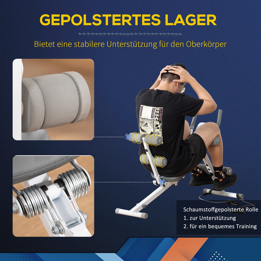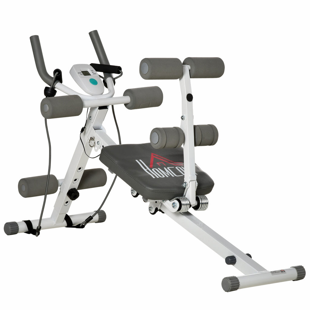 Der HOMCOM Bauchtrainer mit zwei Widerstandsbändern hat einen tragfähigen Stahlrahmen bis 100 kg und ist mit weichen Polstern an Knien und Ellenbogen versehen, die ein angenehmes Training ermöglichen. Ein eingebauter LCD-Monitor des Bauchmuskeltrainers zeigt Kalorienverbrauch, Zählung und Zeit an, um Ihren Fortschritt präzise zu verfolgen. Mit rutschfesten Griffpolstern an den Füßen schützt der Bauchmuskeltrainer den Boden, während Sie trainieren.