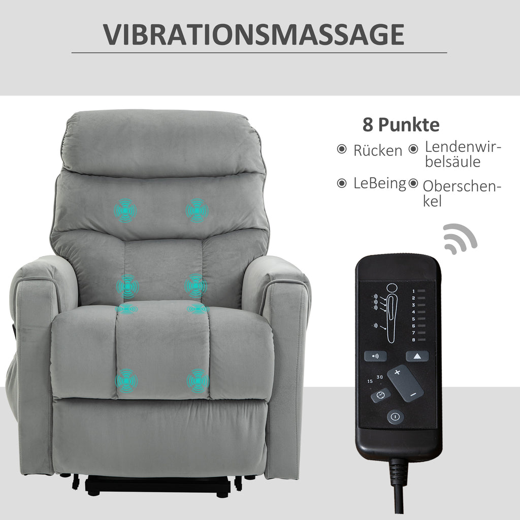 Wenn Sie oder Ihr Angehöriger unter Mobilitätsproblemen leiden, ist dieser elektrische Kinosessel von HOMCOM genau die richtige Wahl für Sie. Mit einem Knopfdruck können Sie mühelos von einer stehenden Position in eine vollständig zurückgelehnte Position wechseln. Großzügig gepolsterte Polsterung mit weichem Mikrofasertuch bietet außergewöhnlichen Komfort und Entspannung. 8 Vibrationsmassagepunkte lindern Muskelschmerzen und -verspannungen, verbessern die Blutzirkulation.