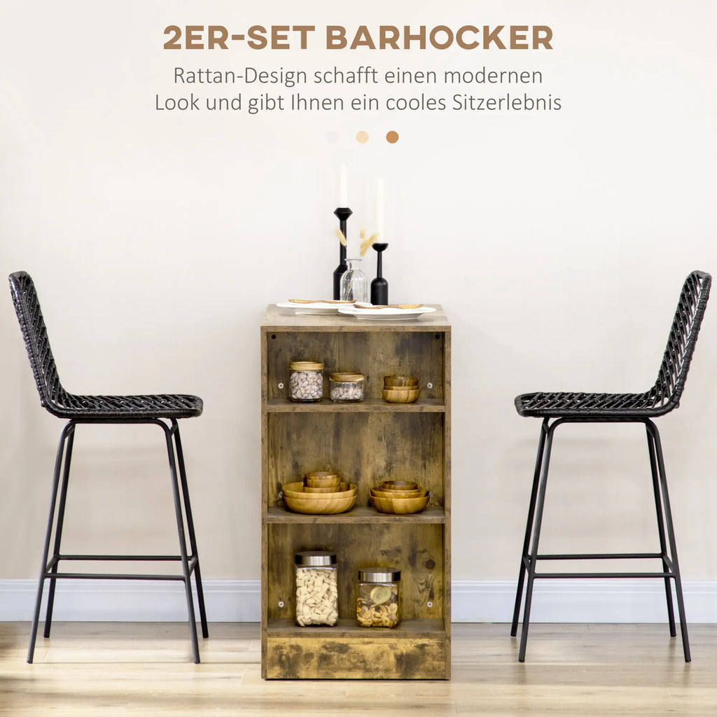 Bringen Sie den Boho-Stil in Ihr Zuhause! Ob für den sonntäglichen Brunch oder den entspannten Abend mit Ihren Lieblingsgetränken – dieses 2er-Set Barhocker erfüllt all Ihre Wünsche. Die Sitzfläche und Rückenlehne in Rattanoptik verleihen dem Küchenhocker Set einen trendigen Boho-Look, während die Stahlbeine für Stabilität sorgen. Eine Fußstütze bietet zusätzlichen Komfort. Bestellen Sie noch heute die stilvollen und bequemen Barhocker von HOMCOM!