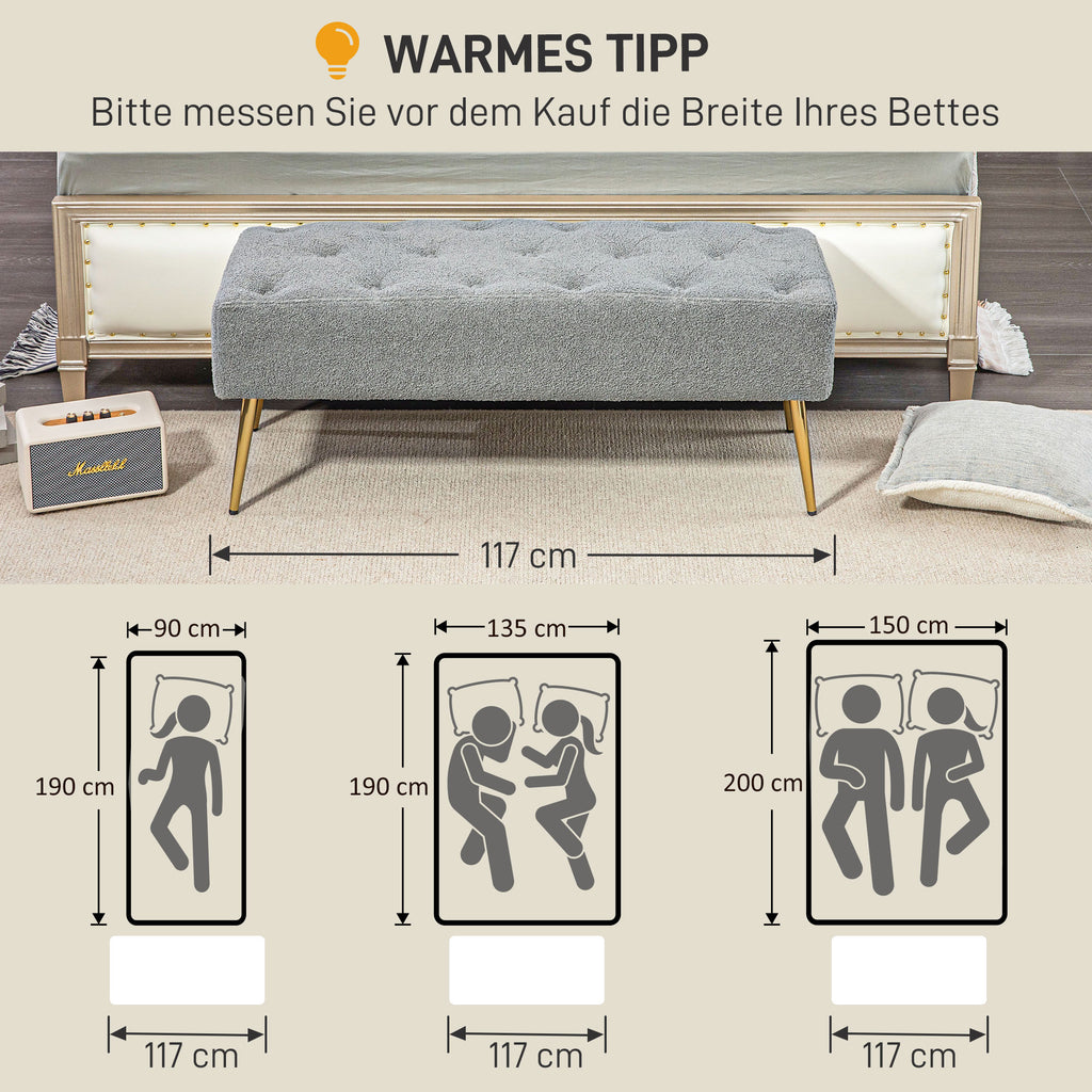Suchen Sie eine elegante und praktische Sitzbank? HOMCOM präsentiert Ihnen diese moderne Bank, ideal für Schlafzimmer, Wohnzimmer, Esszimmer oder Flur. Ob als Sitzgelegenheit, Bettbank oder Flurbank – sie fügt sich perfekt in jeden Raum ein. Die Bank ist mit einem Bezug aus Lammwollimitat und einer dicken Polsterung ausgestattet, die ein bequemes Sitzerlebnis garantiert. Verleihen Sie Ihrem Zuhause ein Gefühl von Wärme und Stil mit HOMCOM.