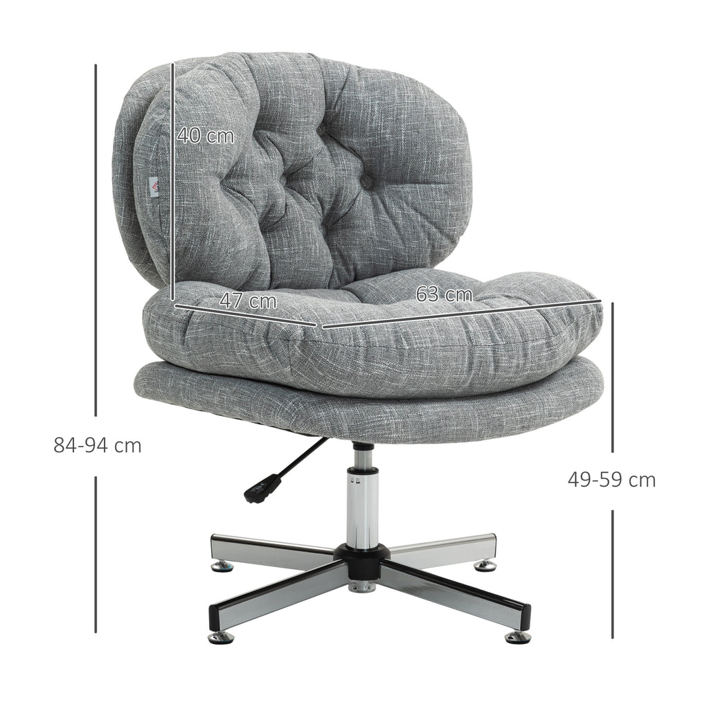 Erleben Sie den Komfort des HOMCOM Bürostuhls mit 18,5 cm dicker Schaumstoffpolsterung und 15 cm dicker Rückenlehne, bezogen mit atmungsaktivem Stoff in Leinenoptik. Die geschwungene Rückenlehne mit Knopfheftung verleiht dem Stuhl Eleganz und Raffinesse. Die Höhe lässt sich dank der sicheren Gasdruckfeder der Klasse 3 ganz einfach verstellen. Dieser Drehstuhl eignet sich ideal für jeden Computertisch oder Arbeitsbereich und ist ein Muss für Ihren Arbeitsplatz.