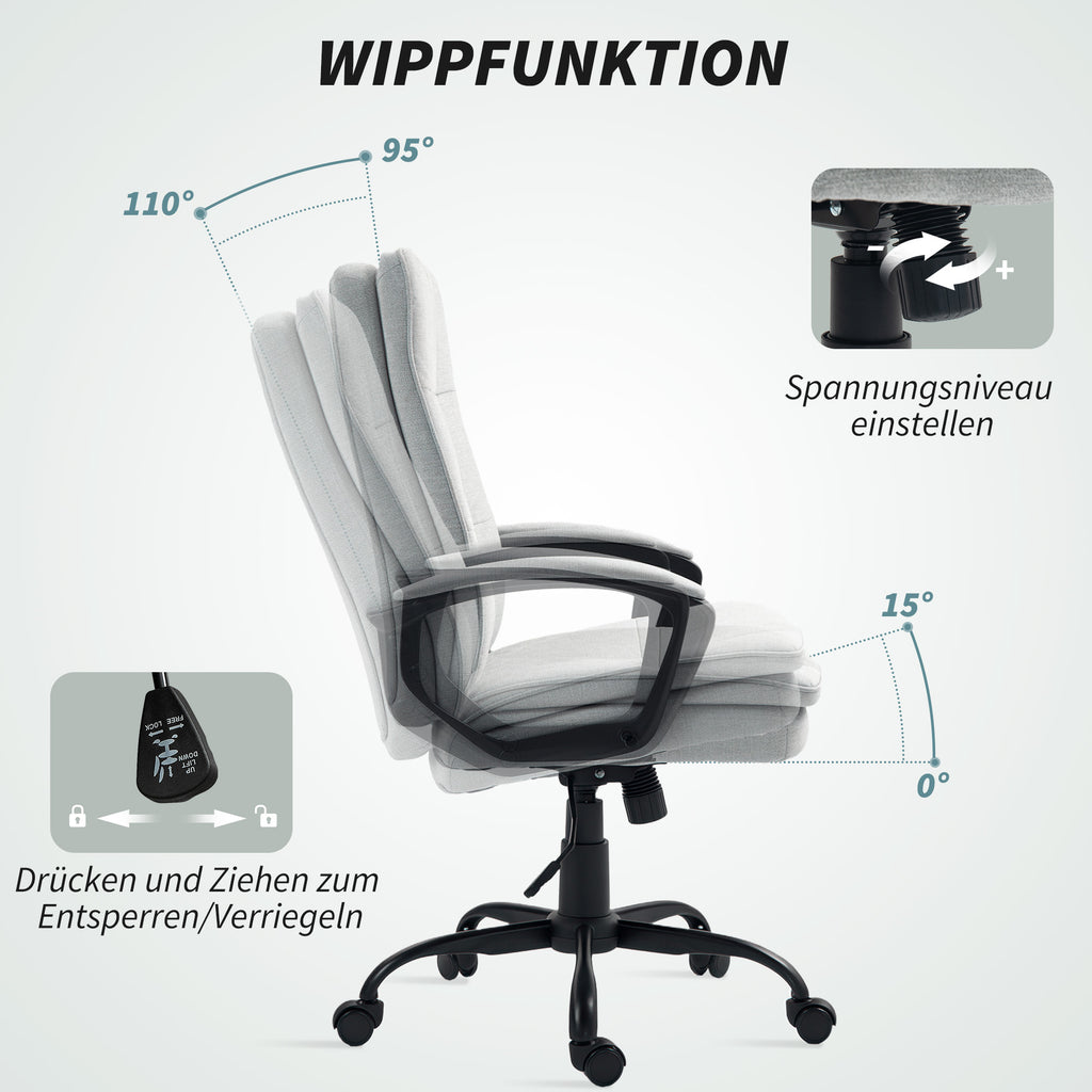 Erleben Sie den luxuriösen Komfort des HOMCOM Bürostuhls, der mit doppellagigem, hochdichtem Schaumstoff gepolstert und in einem atmungsaktiven Stoff bezogen ist. Genießen Sie die Freiheit, nach Belieben zu neigen und zu schaukeln, während die stufenlos verstellbare Sitzhöhe des Computerstuhls mit einem sanften Gaslift sicherstellt, dass Sie immer optimal für maximale Produktivität positioniert sind. Ein stilvolles Highlight für jedes Arbeitsumfeld – für mehr Komfort und Eleganz in Ihrem Büro!
