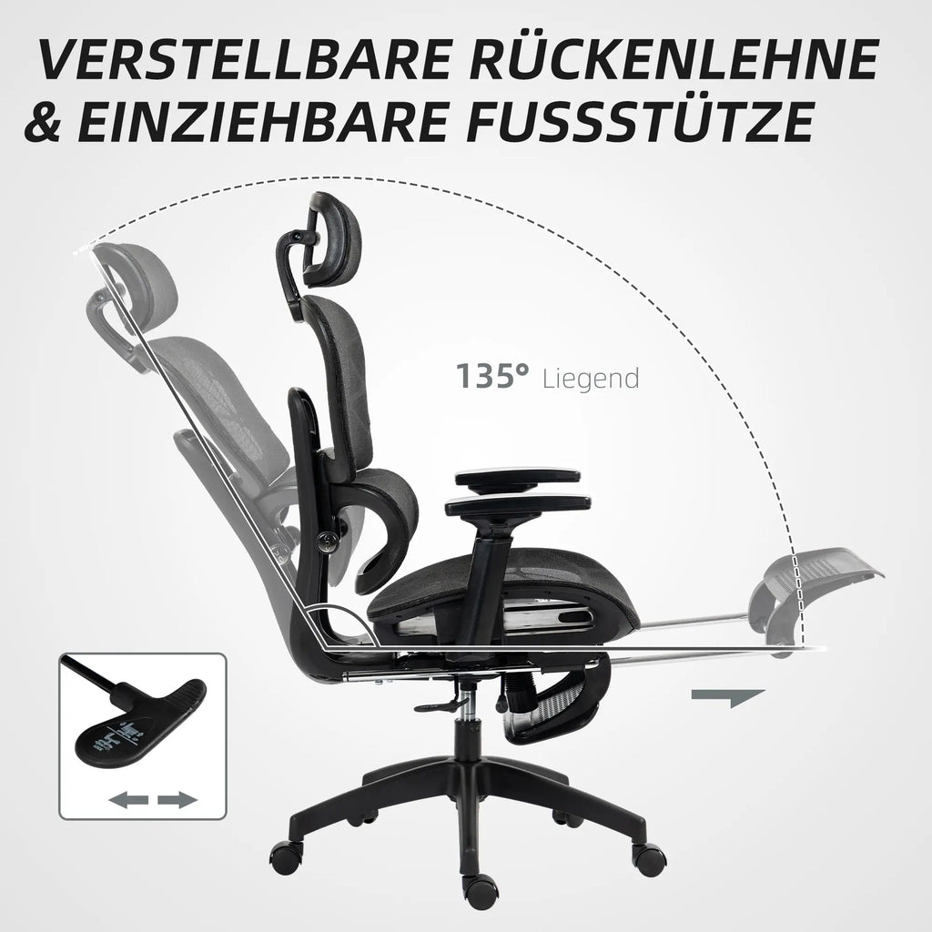 Genießen Sie überragenden Komfort mit dem HOMCOM Bürostuhl. Er verfügt über eine bis zu 135° neigbare Rückenlehne mit drei Arretierungspositionen, für maßgeschneiderte Entspannung. Ein drehbares und höhenverstellbares Kopfteil des Schreibtischstuhls bietet perfekte Nackenunterstützung und die einstellbare Lendenstütze sorgt für Rückenkomfort bei langem Sitzen. Ideal für jedes Büro oder Arbeitszimmer!