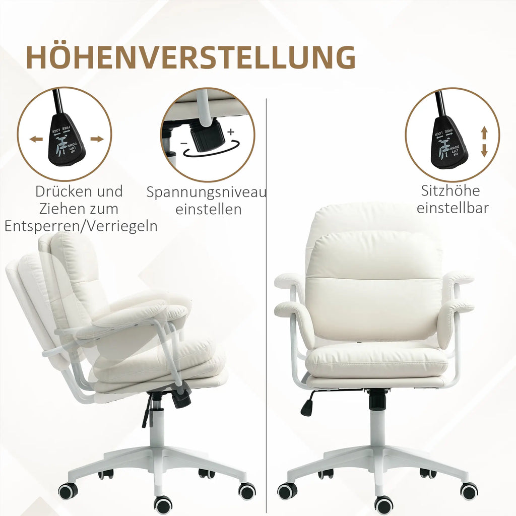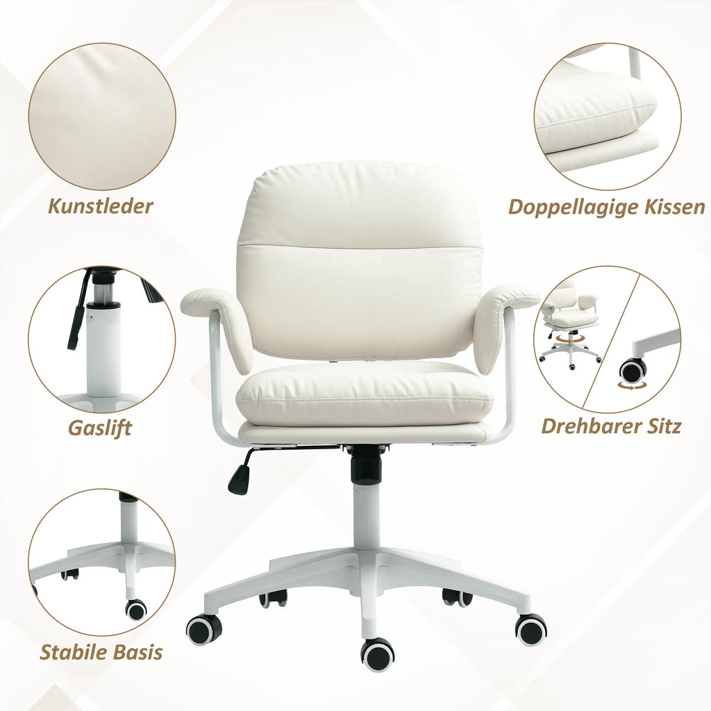 Optimieren Sie Ihren Arbeitsbereich mit dem HOMCOM Drehstuhl mit Rollen, der durch einen Gaslift das Verstellen der Sitzhöhe von 49 cm bis 59 cm ermöglicht und eine Neigefunktion bietet, die ein angenehmes Schaukeln während der Arbeit erlaubt. Die zweischichtigen Polster und breiten Armlehnen des Computerstuhls aus weichem Kunstleder garantieren Komfort und die Kunstleder-Rollen des Computerstuhls gleiten geschmeidig auf allen Bodenarten.