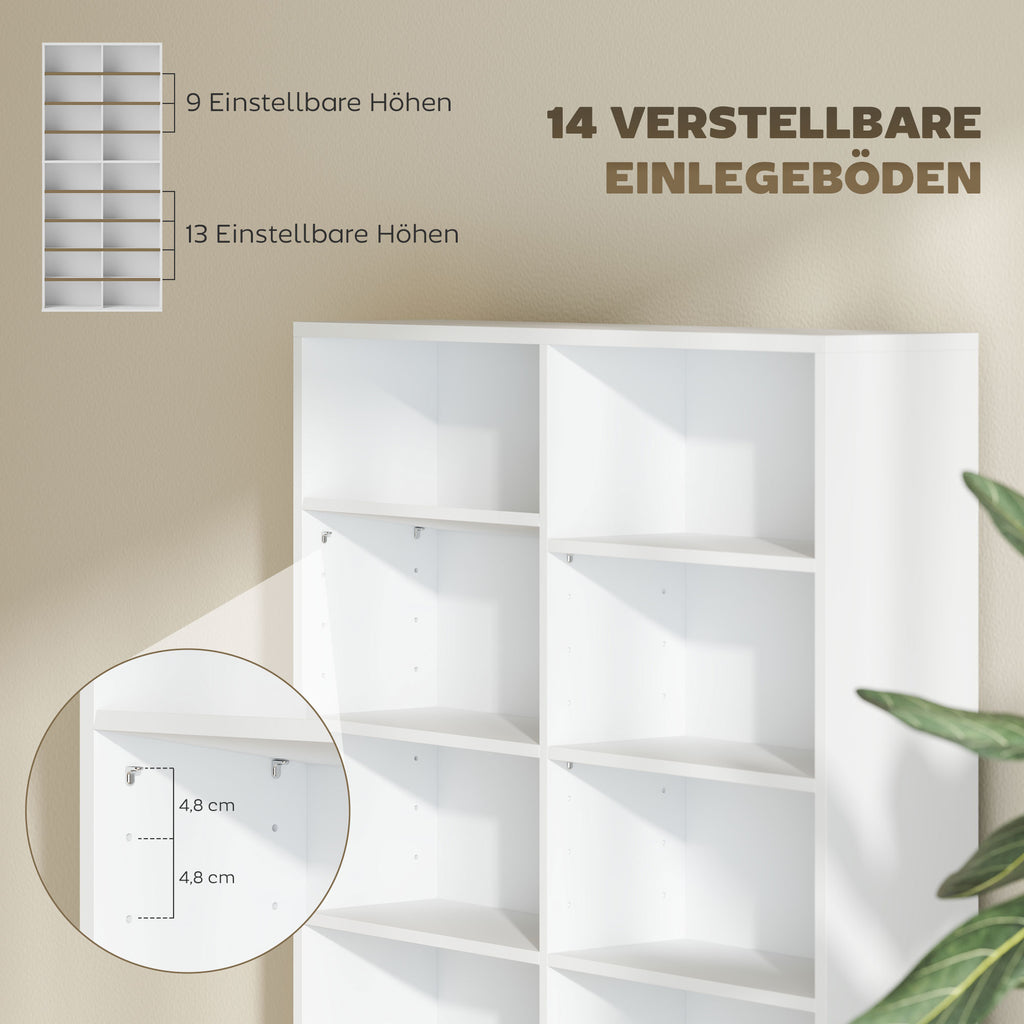 Sie möchten Ordnung in Ihre Medien-Sammlung bringen? Dieser CD Halter von HOMCOM bietet 18 Fächer und 14 anpassbare Regale für bis zu 640 CDs, 360 DVDs oder 430 Blu-rays. Das moderne, platzsparende Design des DVD-Regals fügt sich perfekt in kleine Räume ein und der stabile Rahmen mit Kippschutzgurt sorgt für sicheren Halt. Präsentieren Sie Ihre Schätze stolz, wenn Besuch kommt und finden Sie Ihr eigenes System, um die richtige Disc stets schnell herauszusuchen.