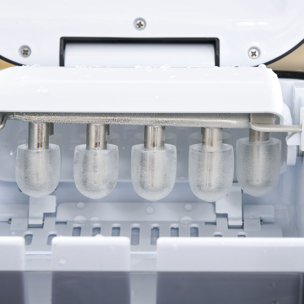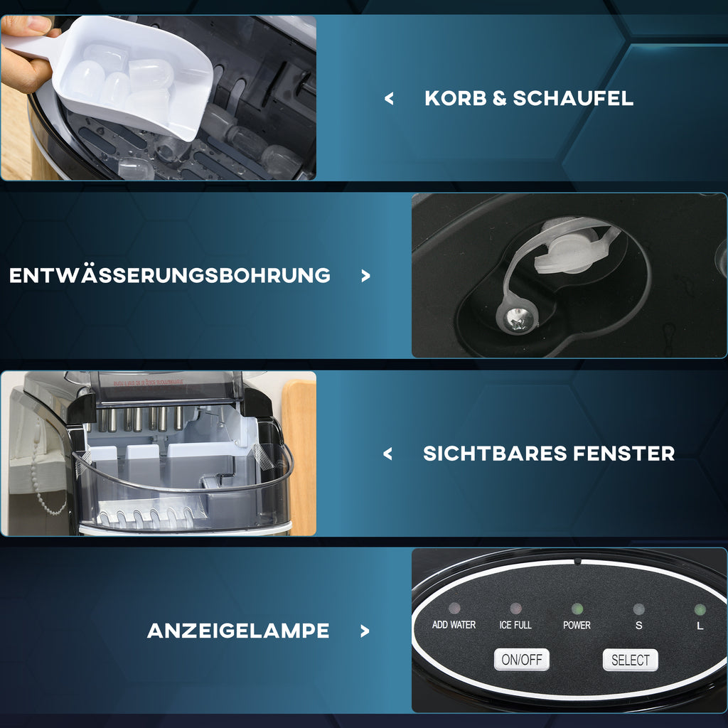 Die unverzichtbare Ergänzung für jede Party, für den Sommer und darüber hinaus: Der Eiswürfelbereiter von HOMCOM. Egal, wie begrenzt Ihr Platzangebot ist, dieses Gerät passt perfekt. Der 1,7-Liter-Tank des Ice Makers produziert beeindruckende 12 kg Eis pro Tag, das entspricht neun kugelförmigen Eiswürfeln alle 6-12 Minuten. Im Lieferumfang enthalten sind ein praktischer Korb und eine Schaufel für den bequemen Gebrauch. Genießen Sie jederzeit erfrischende Getränke!