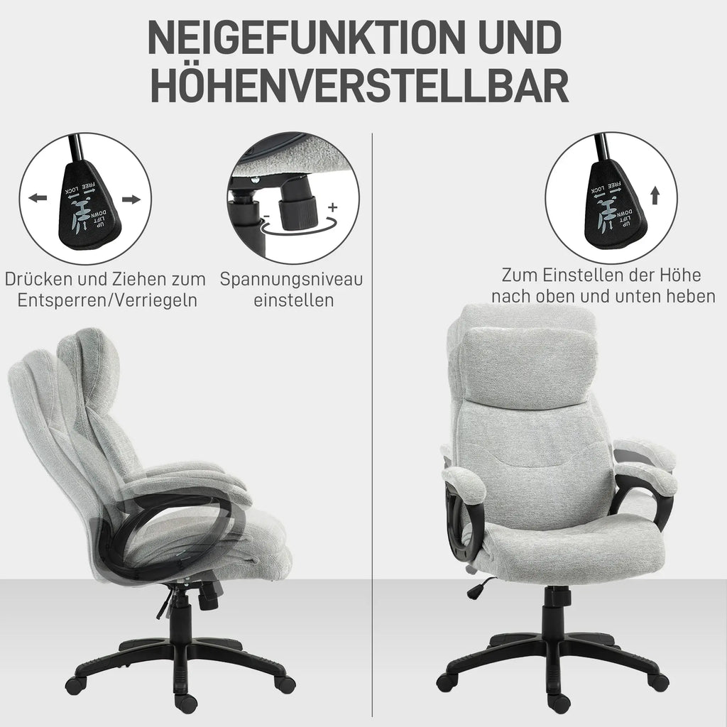 Hier wird der Arbeitskomfort großgeschrieben: Entdecken Sie den HOMCOM ergonomische Stuhl mit seiner angenehm mittelfesten Polsterung und samtweichem Stoffbezug, der Sie sanft umschließt. Nutzen Sie die leicht federnde Rückenlehne des Computerstuhls und verstellen Sie die Sitzhöhe spielend mit dem Gaslift. Ideal für das Heimbüro oder das Lernzimmer, vereint dieser Drehstuhl mit Rollen Eleganz und Bequemlichkeit.