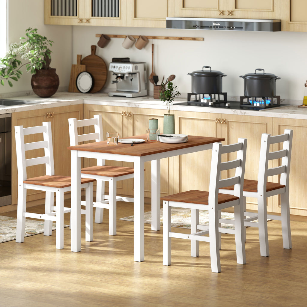 Erleben Sie mit der HOMCOM Essgruppe einen aufgeräumten Essbereich, da die Stühle leicht unter den Tisch geschoben werden können, perfekt für kleine Räume. Ein warmer Braunton und strahlend weiße Beine bringen rustikalen Charme in Ihre Küche. Aus massiver Kiefer gefertigt, bietet diese Sitzgruppe Langlebigkeit und ein natürliches Ambiente, das Ihre Mahlzeiten mit Freunden und Familie stilvoll bereichert.