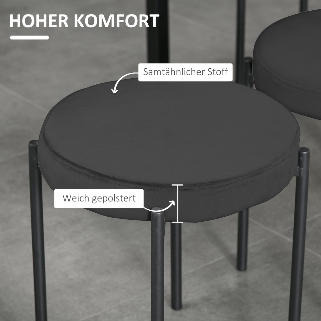 Verwandeln Sie Ihre Essecke in eine stilvolle Geschmacksoase mit den HOMCOM Küchenstühlen. Diese Esszimmerstühle mit einem schönen Bezug in Samtoptik, bieten nicht nur einen niveauvollen Anblick, sondern auch ein unvergleichliches Sitzgefühl dank der weichen Polsterung. Ideal für kleinere Räume, lassen sich diese Küchenstühle einfach stapeln und verstauen. Nicht nur als Essstuhl und Esszimmerstuhl, sondern auch als Wohnzimmerstuhl macht jeder Hocker eine tolle Figur.