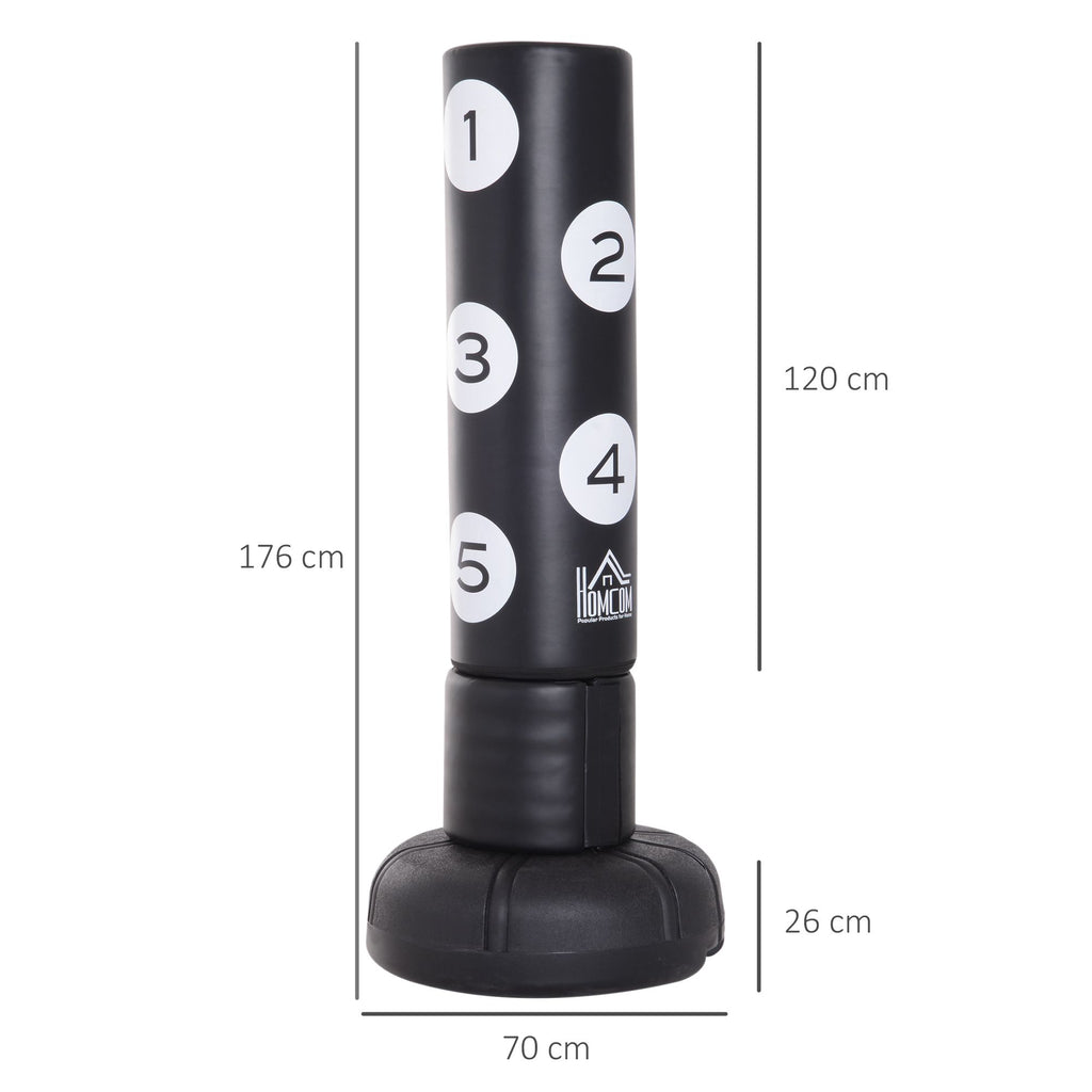 Mit dem Standboxsack von HOMCOM gelingt das Training zuhause leicht und sicher. Für einen stabilen Stand sorgt der massive Kunststofffuß, der sich wahlweise mit Wasser oder feinem Sand befüllen lässt. Die Schlagoberfläche des Standboxsacks ist strapazierfähig und gepolstert und dank des FLEX-Systems federt der Boxständer Kicks und Schläge verletzungssicher ab. Die Nummerierung der Oberfläche lässt Sie zudem Haken, Schläge und Kicks zielgenau trainieren und Aufbau und Befüllung gehen einfach und schnell.