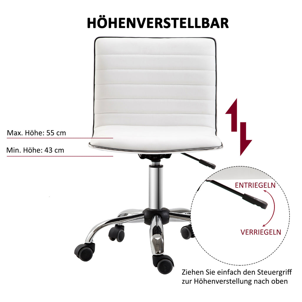 Entspannen Sie sich mit unserem Bürostuhl mit Schwerpunkt auf Ergonomie, der für die meisten Körpertypen eine bequeme Haltung bietet. Der Stuhl verfügt über eine 360-Grad-Drehfunktion und eine pneumatische Einstellstufe. Ideal für Bars, Kosmetikstudios oder Friseursalons und mehr. Minimales Design für maximalen Komfort.