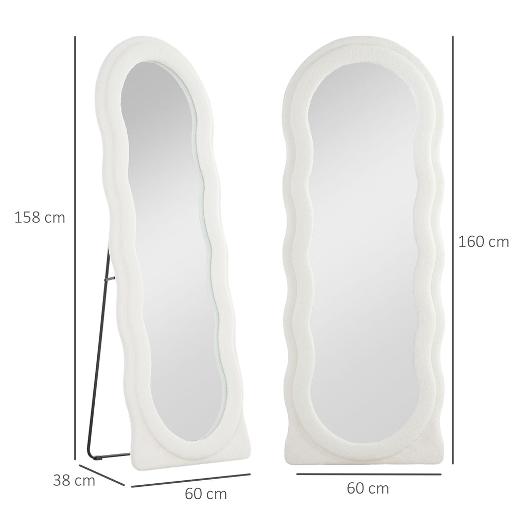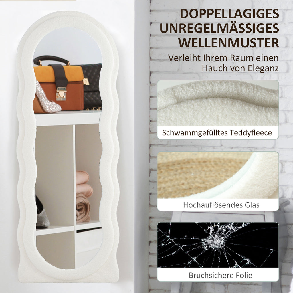 Entdecken Sie unseren stilvollen HOMCOM Wandspiegel in voller Länge, umgeben von einem doppelten, welligen Rahmen und weichem Teddy-Fleece. Mit einer Größe von 160 x 60 cm ermöglicht der großzügige Ganzkörperspiegel eine vollständige Betrachtung, sodass Sie sich von Kopf bis Fuß perfekt präsentieren können. Das hochauflösende Glas mit bruchsicherer Rückwand garantiert klare Sicht und Sicherheit. Ideal für Schlaf- oder Ankleidezimmer, kann dieser Flurspiegel an die Wand gehängt, angelehnt oder freistehend genutzt werden.