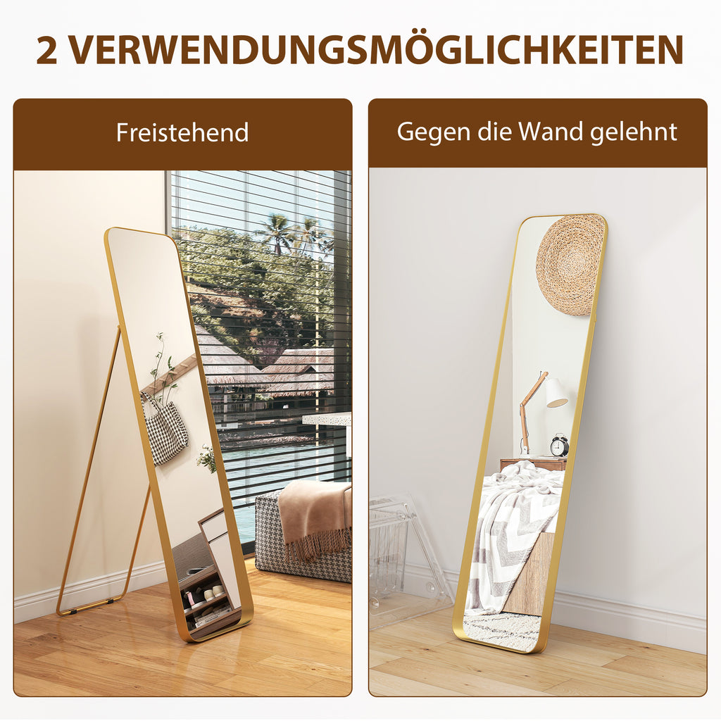 Betrachten Sie sich vollständig mit dem HOMCOM Ganzkörperspiegel, einem beeindruckenden Highlight für jeden Raum. Dieser hohe Flurspiegel (160 x 40 cm) ermöglicht eine komplette Ansicht Ihres Körpers und verfügt über eine Kippfunktion für die ideale Sicht. Der goldfarbene verjüngenden Rahmen sorgt nicht nur für einen eleganten Touch, sondern auch für sicheren Stand, egal ob frei stehend oder an die Wand Ihres Schlafzimmers gelehnt.