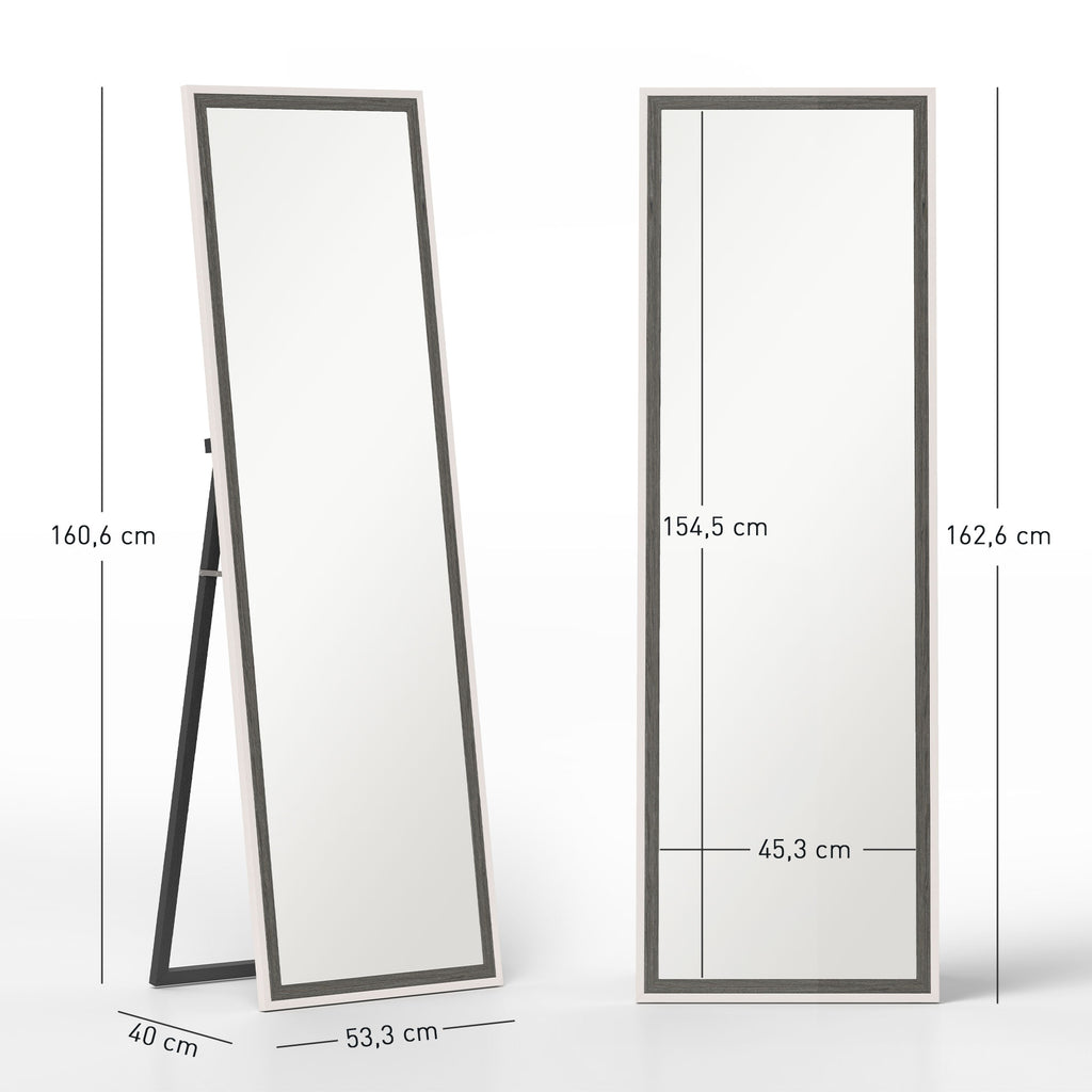 Der Bodenspiegel von HOMCOM mit seinem zweifarbigen MDF-Rahmen in schickem Weiß und Grau bietet Stil und Funktionalität. Auf 162,6 x 53,3 cm zeigt er eine tadellose Ganzkörperansicht durch hochauflösendes Glas, gesichert durch eine splitterfeste Folie. Stellen Sie ihn auf, lehnen Sie ihn an oder befestigen Sie ihn an der Wand, ideal für jede Raumsituation.