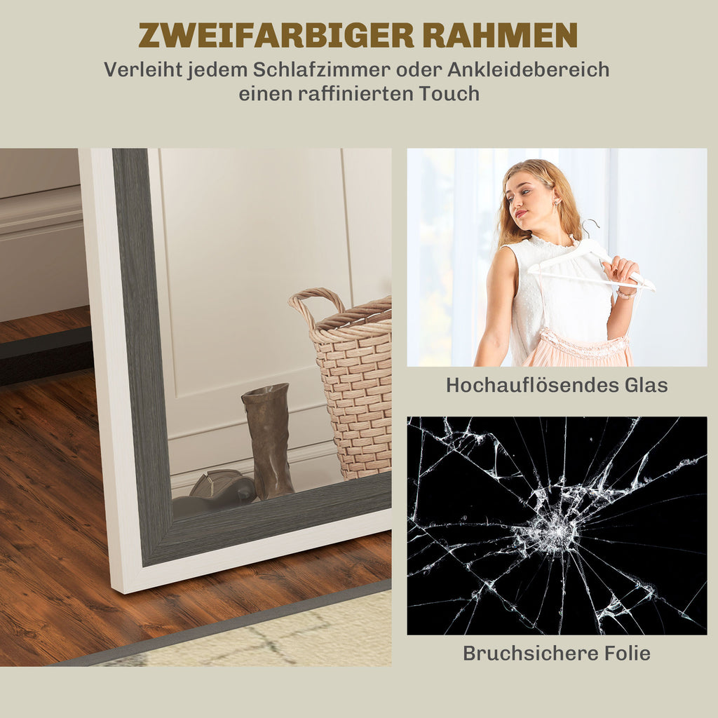 • Zweifarben-Eleganz: Umrahmt in einer ansprechenden Kombination aus weißem und grauem Holzdekor, verleiht dieser freistehende Spiegel jedem Schlafzimmer oder Ankleidebereich einen eleganten Akzent.