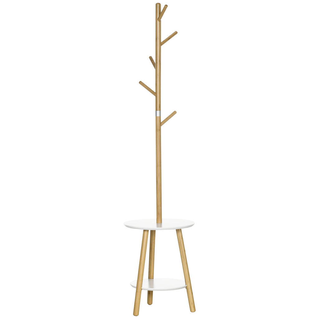 Dieser HOMCOM 2-in-1-Garderobenständer ermöglicht es Ihnen, Ihre Mäntel, Taschen und Schals an die Haken zu hängen und kleine Gegenstände auf dem Beistelltisch abzulegen. Die Doppelfunktion macht diesen Garderobenständer besonders praktisch. Die lackierte Oberfläche ist wasserabweisend, pflegeleicht und langlebig. Das moderne Design im Skandi-Design passt gut zu unterschiedlichen Einrichtungen.