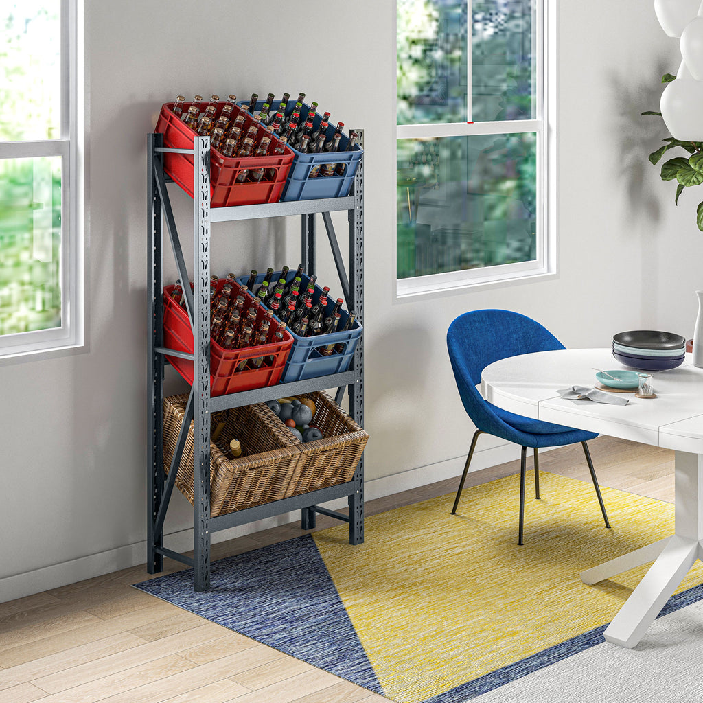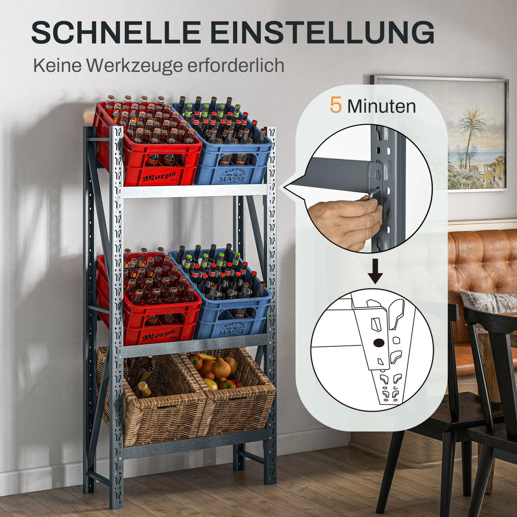 Mit dem HOMCOM Getränkekistenregal machen Sie sich Ihre persönliche Organisation leichter! Dieses Bierkistenregal bietet auf drei Ebenen Platz für bis zu 6 Getränkekisten und sorgt dafür, dass Ihre Lieblingsgetränke stets griffbereit sind. Doch das ist nicht alles: Passen Sie die Regale flexibel an, um auch Obst, Gemüse oder sogar Wäscheutensilien problemlos zu verstauen. Eine clevere, vielseitige Lösung, um Ihr Zuhause zu entrümpeln und den Stauraum optimal zu nutzen.