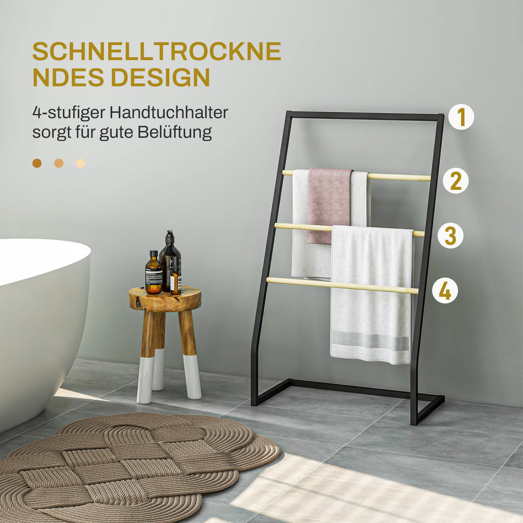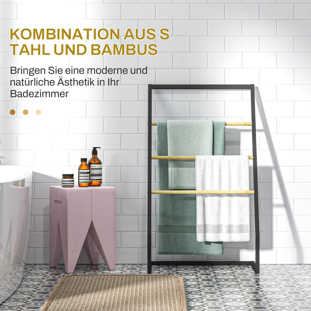 Verleihen Sie Ihrem Badezimmer mit dem freistehenden Handtuchhalter von HOMCOM einen Hauch von Stil und Funktionalität. Dieser elegante Handtuchständer kombiniert vier Ebenen aus Stahl mit Bambus und bietet so eine perfekte Mischung aus modernem Design und natürlicher Ästhetik. Dank der optimalen Abstände zwischen den Stangen können Sie mehrere Handtücher gleichzeitig und effizient aufhängen. Leicht und platzsparend, passt er ideal neben Ihre Dusche oder Badewanne.