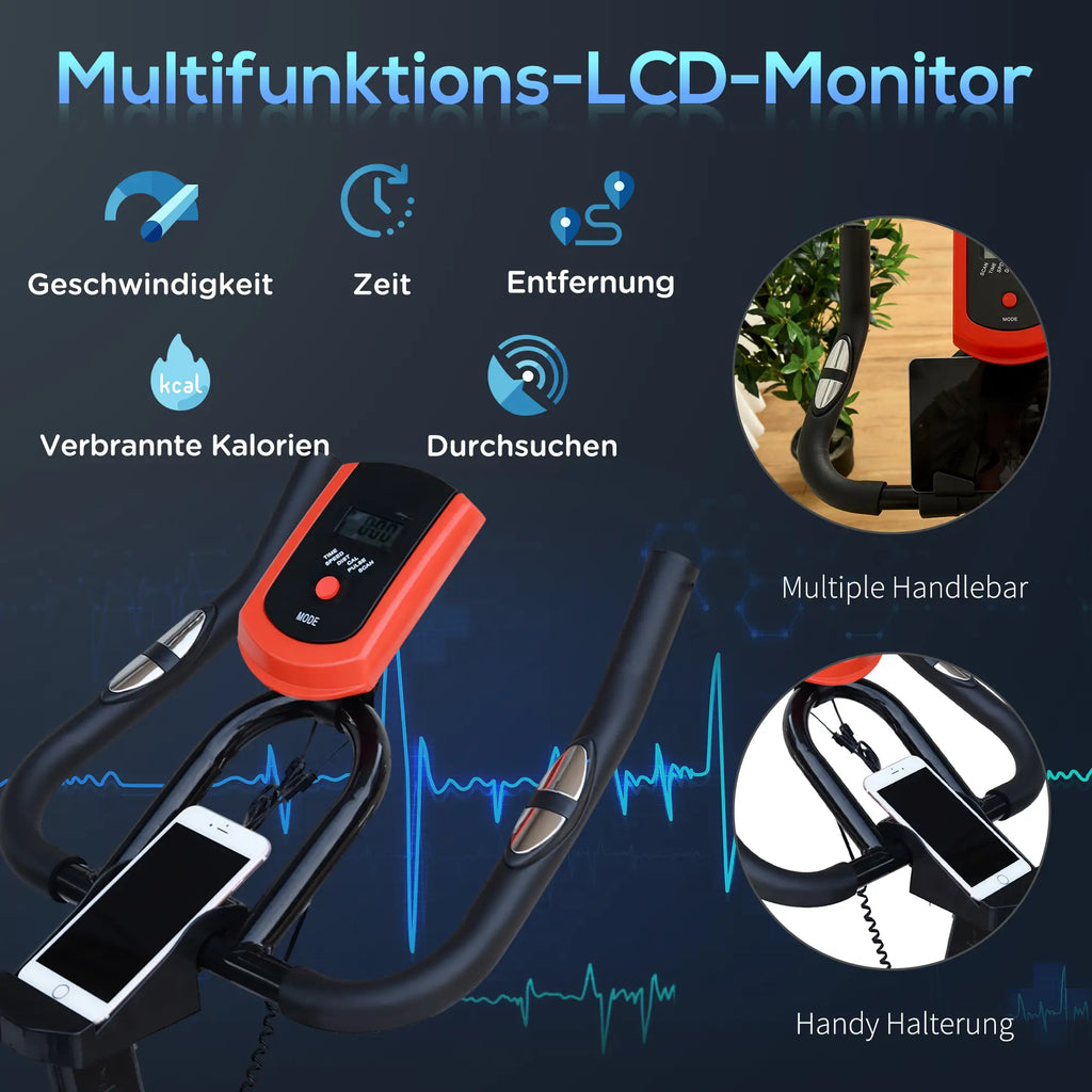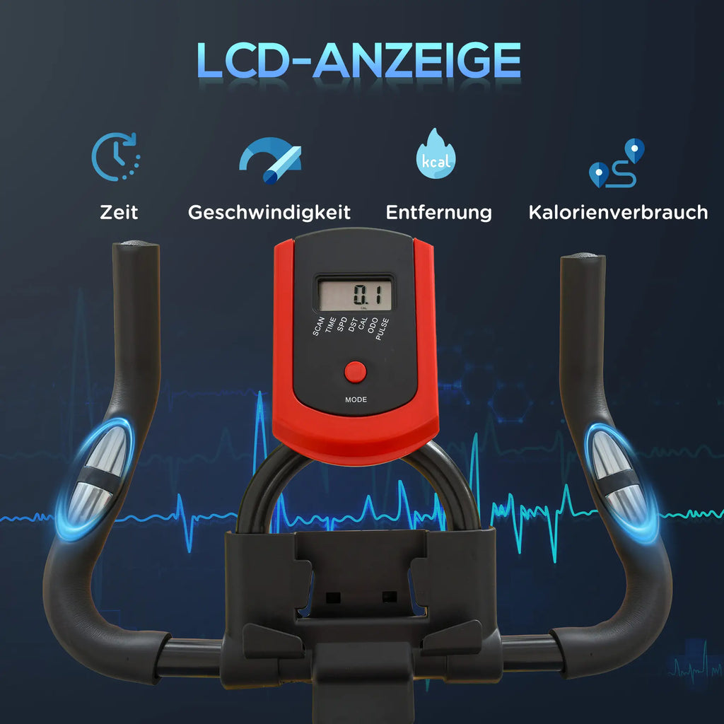 - LCD-Display zeigt Trainingsdaten wie Zeit, Geschwindigkeit, Distanz und Kalorienverbrauch