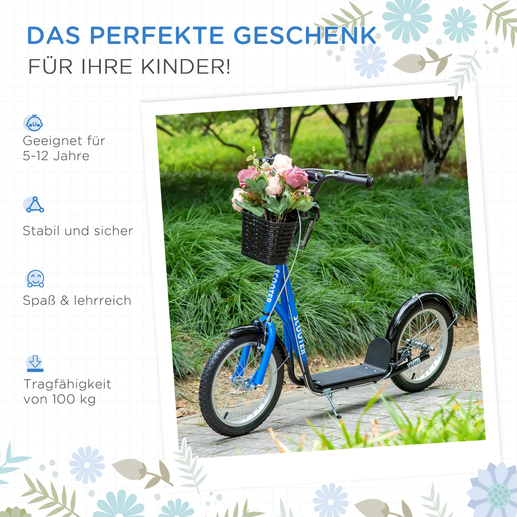 Dieser Tretroller von HOMCOM ist nicht nur ein Blickfang, sondern auch mit einem doppelten Bremssystem ausgestattet, das Ihren Kindern ein sicheres und sofortiges Anhalten ermöglicht. Die niedrige Plattform und die großen Gummireifen mit Profil sorgen für eine sanfte und angenehme Fahrt. Zusätzlich bieten der Kunststoffkorb und der metallene Becherhalter praktischen Stauraum für Ihre Vorräte. Dank der Schutzbleche können sogar nasse Straßen sauber und flott befahren werden!