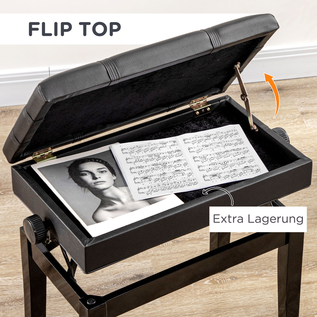 Diese wunderschöne Sitzbank von HOMCOM wird sich perfekt an Ihr Klavier und in Ihren Musikraum einfügen! Mit ihrem Design, das Modernität und Eleganz vereint, und ihrem hohen Sitzkomfort dank der dicken Polsterung und der verstellbaren Sitzhöhe haben Sie eine hervorragende Grundlage, um ein wahrer Maestro am Klavier zu werden!