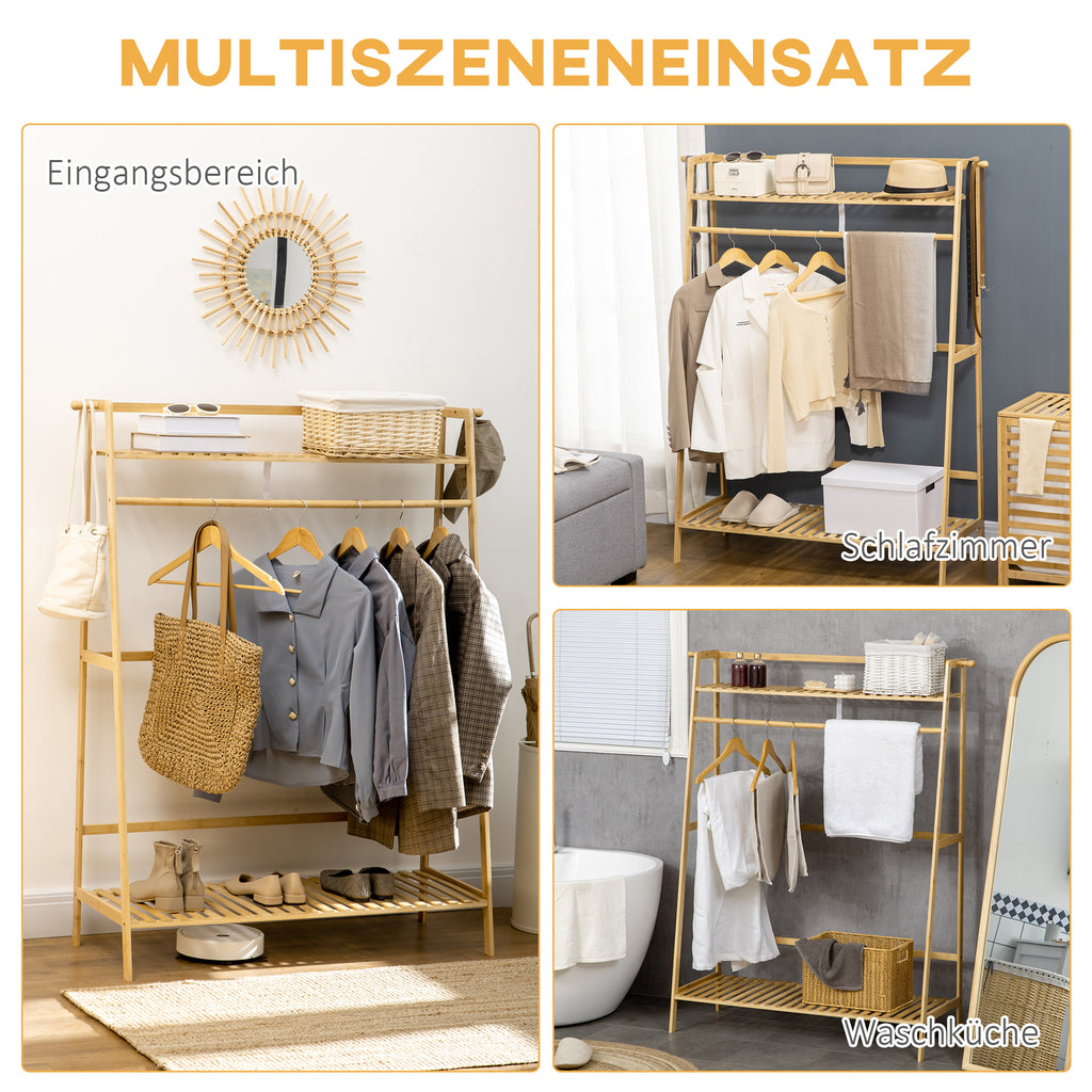 Genießen Sie mehr Ordnung und System in Ihrem Heim mit dem Garderobenständer von HOMCOM. Er bietet zwei Kleiderhaken und eine Kleiderstange für Mäntel, Schals und Taschen, sowie zwei offene Ablagen für Körbe und tägliche Utensilien, wodurch alles übersichtlich bleibt. Der Rahmen aus natürlichem Bambus verleiht jedem Eingang, Wohn- oder Schlafzimmer stilvolle Funktionalität.