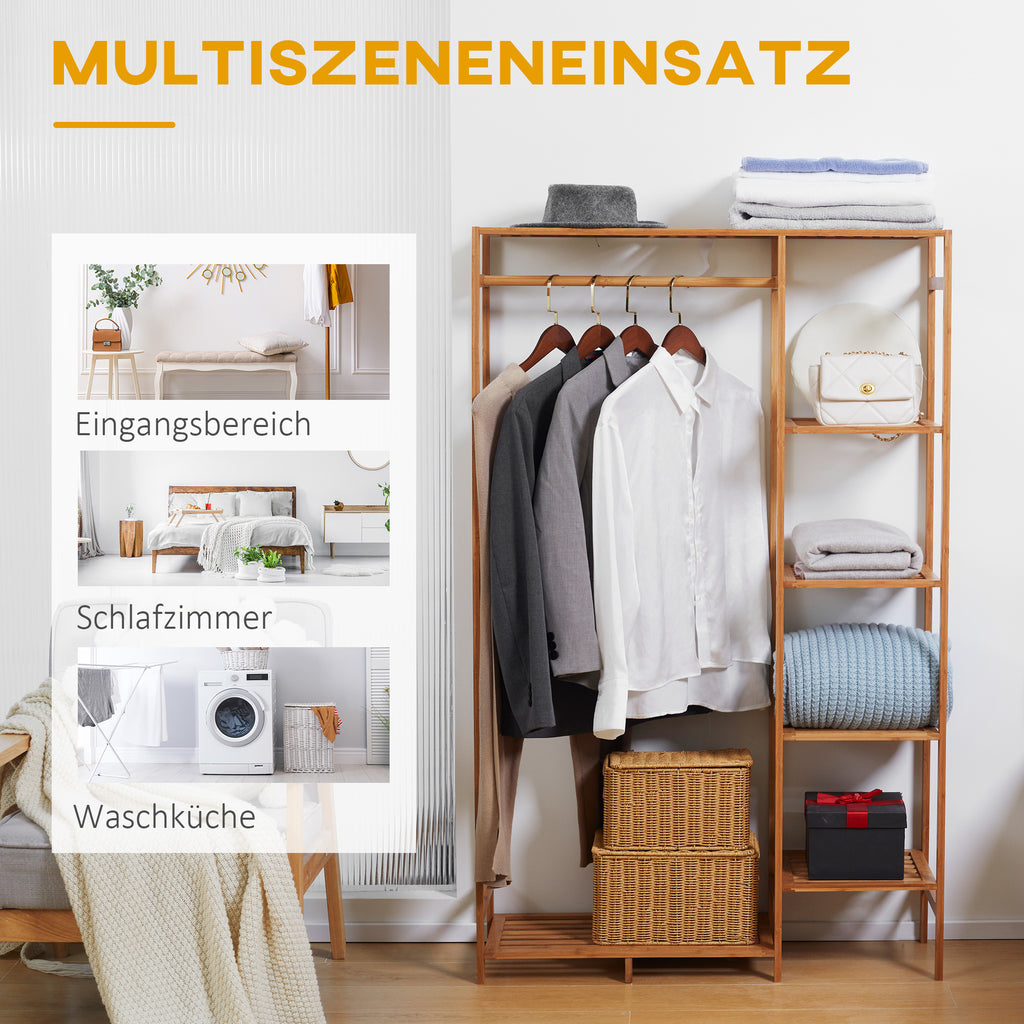 Ein unverzichtbares Schlafzimmermöbel in klassischem Design: der Bambus-Kleiderständer von HOMCOM. Gefertigt aus stabilem Holz, verfügt der Jackenständer über eine Kleiderstange, vier Seitenablagen und ein oberes Fach, bietet somit umfangreichen Platz für verschiedenste Kleidungsstücke, egal ob aufgehängt oder gefaltet. Die kompakte, kubische Form des Holz-Garderobenständers ist ideal für kleinere Räume – optimal für Gästezimmer und mehr.