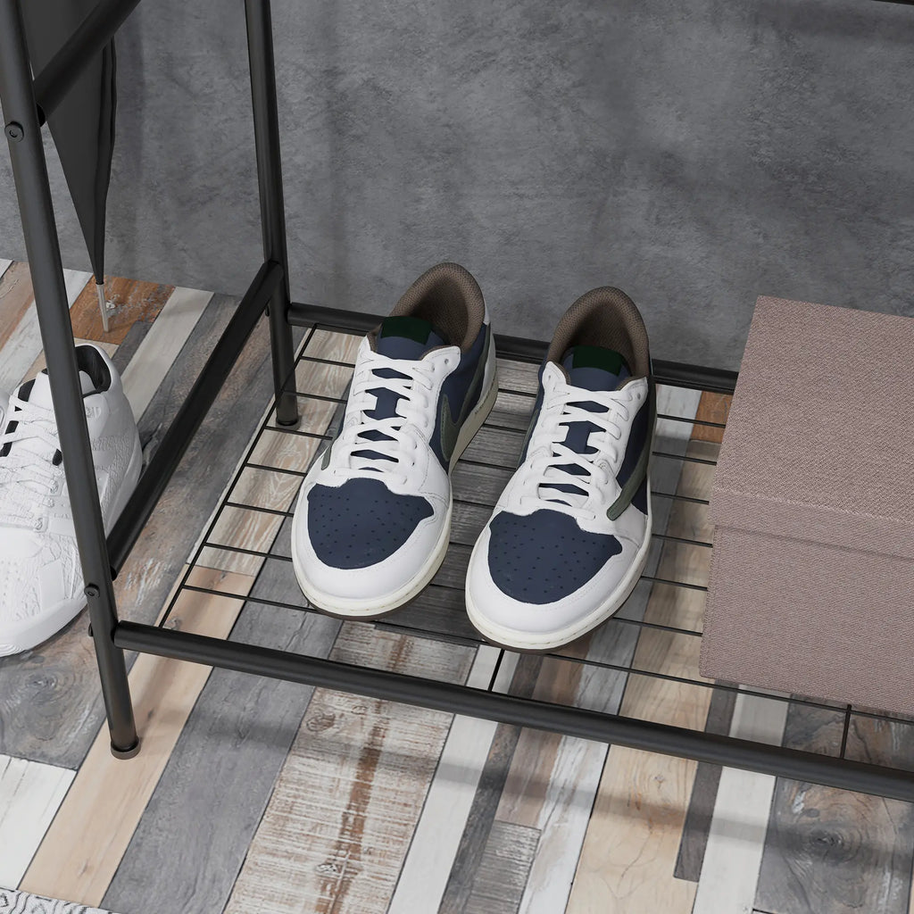 Verleihen Sie Ihrem Raum einen frischen Look mit dem HOMCOM Kleiderständer. Dieser stilvolle Garderobenständer kombiniert einen robusten Stahlrahmen mit eleganten Bambuselementen und schafft so eine moderne, natürliche Ästhetik. Ausgestattet mit zwei Kleiderstangen und einem seitlichen Kleiderhaken, wird die Organisation Ihrer Garderobe zum Kinderspiel. Das untere Regal des Kleiderständers bietet Platz für bis zu drei Paar Schuhe oder zur ordentlichen Aufbewahrung von Schuhboxen.