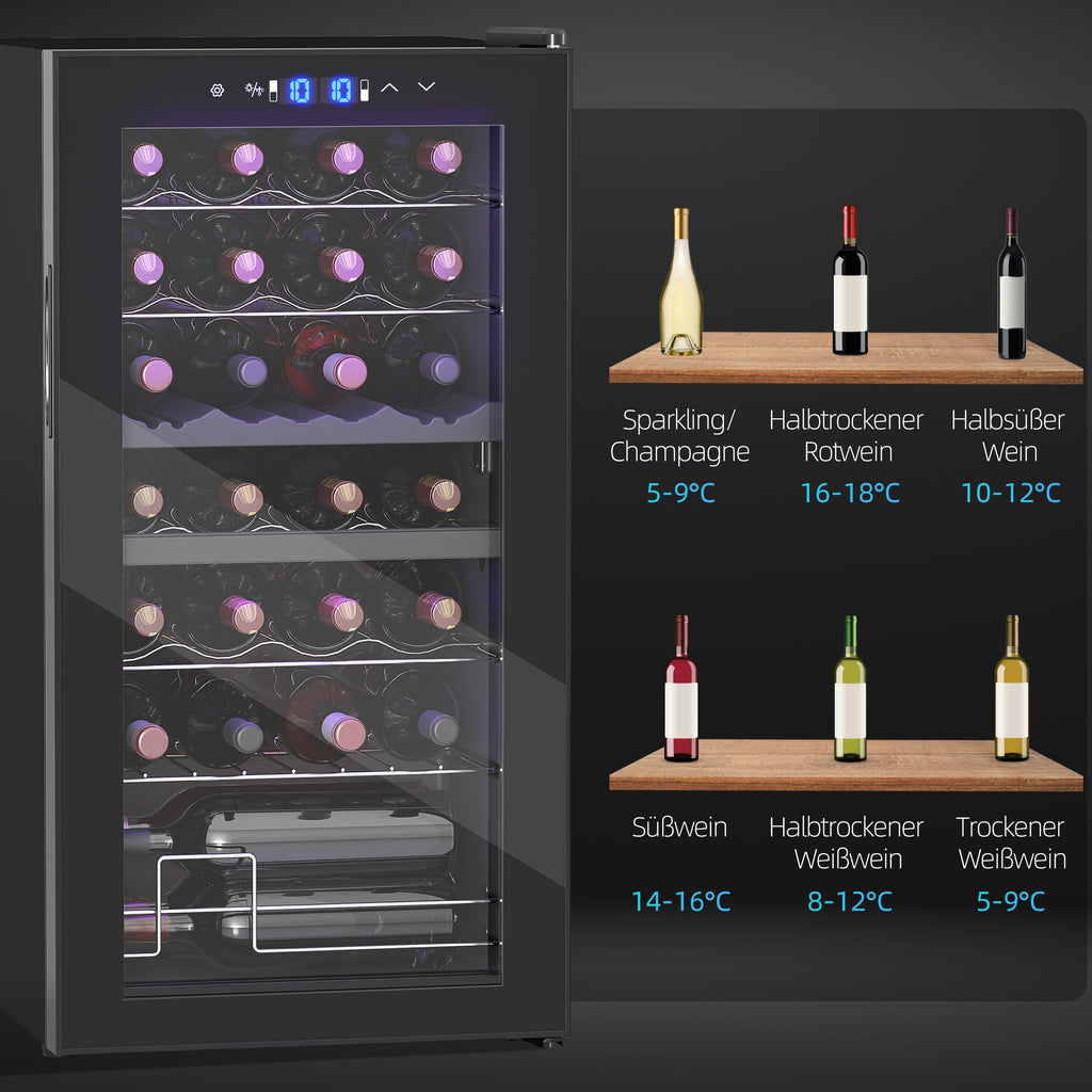 Genießen Sie perfekt temperierte Weine mit dem HOMCOM Weinkühler und seinem intelligenten Dual-Zonen-Design für individuelle Temperaturen von 5-18℃. Egal ob Rot-, Weißwein oder Prosecco – Ihre Getränke bleiben ideal gekühlt. Das elegante LED-Display und die benutzerfreundlichen Touch-Steuerungen des Flaschenkühlschranks ermöglichen zudem die Umstellung zwischen Celsius und Fahrenheit.