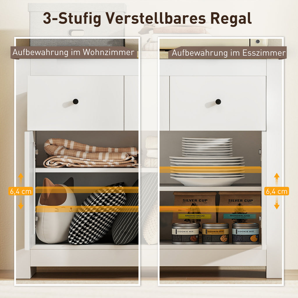 Optimieren Sie Ihren Wohnbereich mit dieser Kommode, die für stilvolle Ordnung sorgt. Zwei sanft gleitende Schubladen und ein großzügiger Doppeltürschrank bieten viel Stauraum. Das elegante, zweifarbige Design des Beistellschranks fügt sich nahtlos in jede Einrichtung ein und eignet sich ideal für Wohnzimmer, Küche, Flur oder Esszimmer. Perfekt, um Dekorationsgegenstände zu präsentieren, Haushaltsartikel zu verstauen oder Snacks zu lagern.
