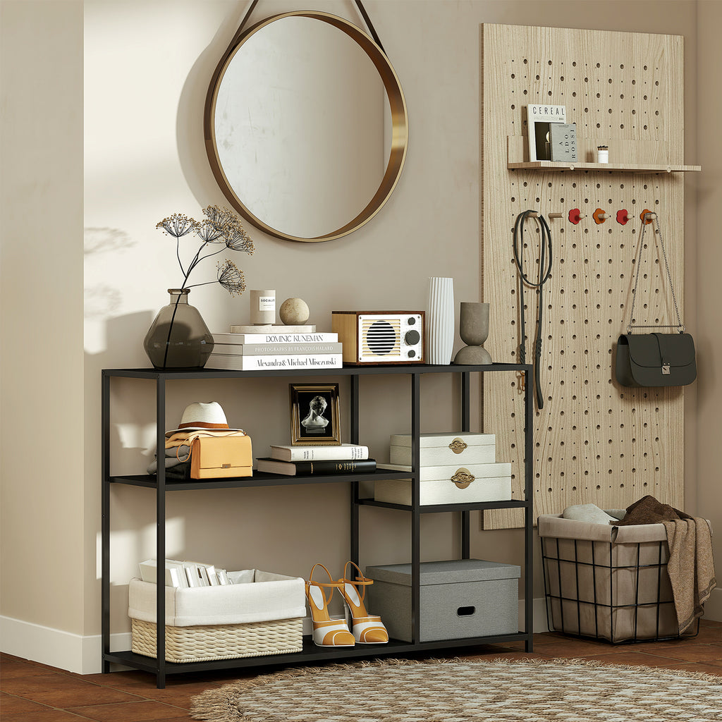 Gestalten Sie Ihren Eingangsbereich neu mit dem stilvollen HOMCOM Konsolentisch. Dieser Hochtisch ist mehr als ein praktisches Möbelstück – er setzt ein ausdrucksstarkes Designstatement und wertet Ihren Wohnbereich auf. Ausgestattet mit mehreren Ablagen, kombiniert er umfangreichen Stauraum mit attraktiver Ausstellungsfläche. Kreiert, um als zentraler Blickfang Ihre Wohnatmosphäre zu bereichern, ideal für Deko oder tägliche Gebrauchsgegenstände.