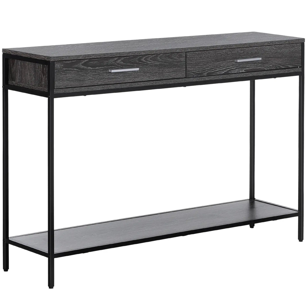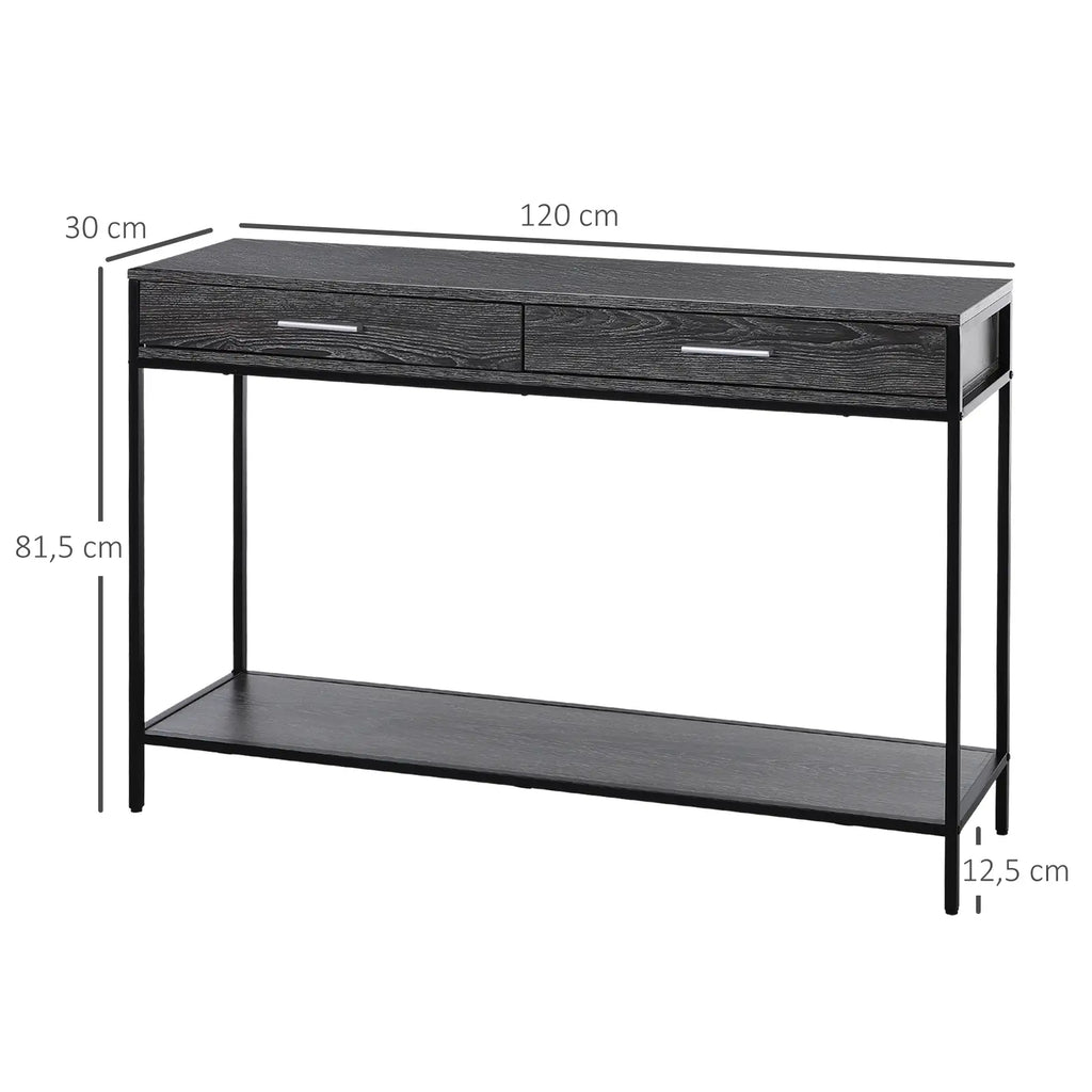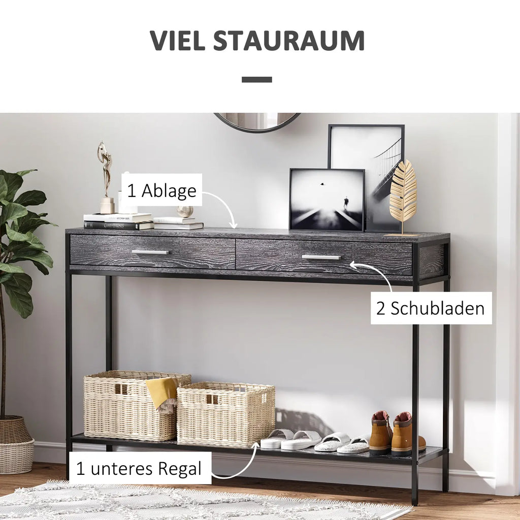 Dieser schöne Konsolentisch von HOMCOM ist die perfekte Ablage für Flur, Wohnzimmer oder jeden anderen Bereich Ihres Zuhauses. Er verfügt über zwei Schubladen sowie ein stabiles Regal im unteren Bereich. Im Flur können Sie die Konsole beispielsweise nutzen, um Schlüssel abzulegen, Schuhe abzustellen, Handschuhe und Regenschirm in den Schubladen aufzubewahren. Der Konsolentisch besteht aus einem soliden Metallrahmen und stabilen Spanplatten mit Melaminbeschichtung. Die Beschichtung macht ihn pflegeleicht sowie wasser- und kratzfest. Das schlichte Möbelstück fügt sich prima in jeden Einrichtungsstil ein.