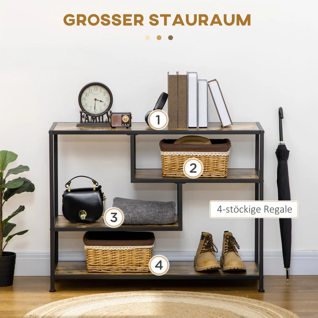 Suchen Sie nach einer stilvollen Aufbewahrungslösung für Ihren Eingangsbereich? Dieser Konsolentisch ist das perfekte Schmuckstück, um Ihre Lieblingsstücke zu präsentieren. Mit 4 offenen Regalen bietet es Platz für Taschen, Schlüssel und persönliche Gegenstände. Gefertigt aus robustem Stahl und Spanplatte, ist es langlebig und pflegeleicht. Das Anti-Kipp-Design des Flurtisches sorgt für zusätzliche Stabilität. Bringen Sie industriellen Charme in Ihren Flur, Ihr Wohnzimmer oder Schlafzimmer.