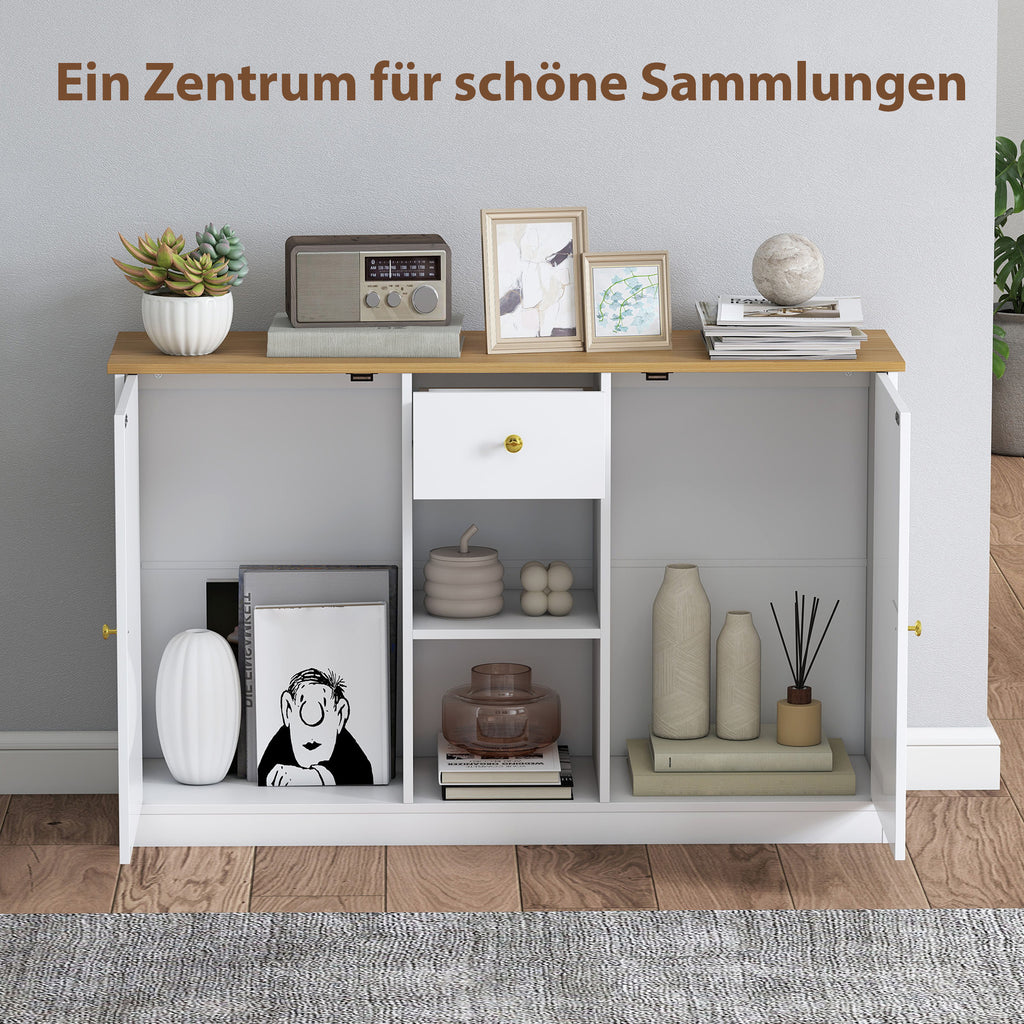 Suchen Sie eine elegante Lösung, um Ordnung zu schaffen? Das moderne Sideboard von HOMCOM bietet viel Stauraum mit einer breiten Oberfläche, einer Schublade, zwei Schränken und zwei offenen Regalen – ideal für Geschirr, Bücher oder tägliche Essentials. Das frische weiße Design des Wohnzimmerschranks mit Holzoptik-Platte, Shaker-Türen und goldenen Griffen sorgt für eine gemütliche, stilvolle Note. Perfekt für Wohnzimmer, Esszimmer, Flur oder Küche.