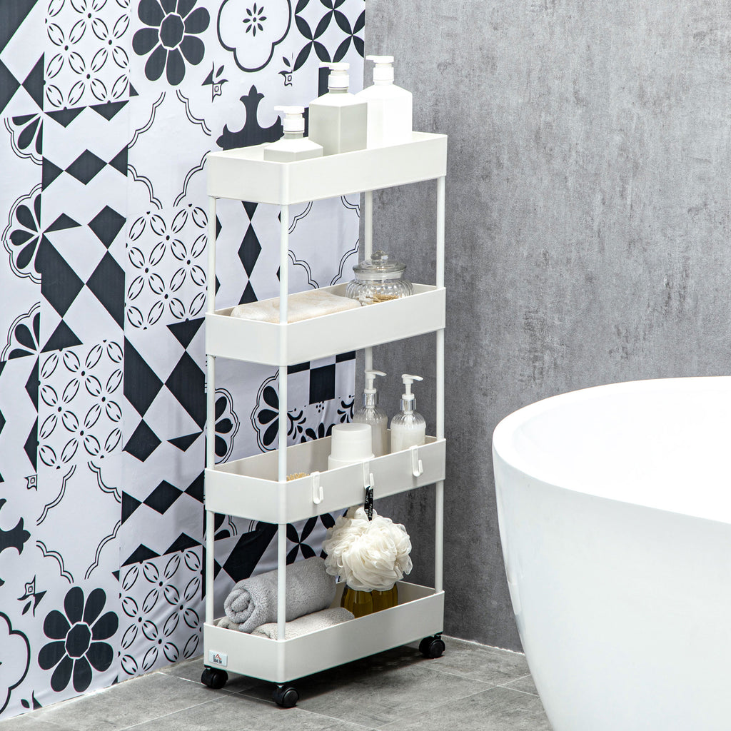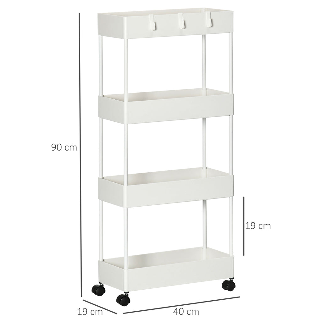 HOMCOM Küchenwagen mit 4 Regalen, 4 flexiblen Haken, 4 Rollen, 40 cm x 19 cm x 90 cm, Nischenwagen, Weiß