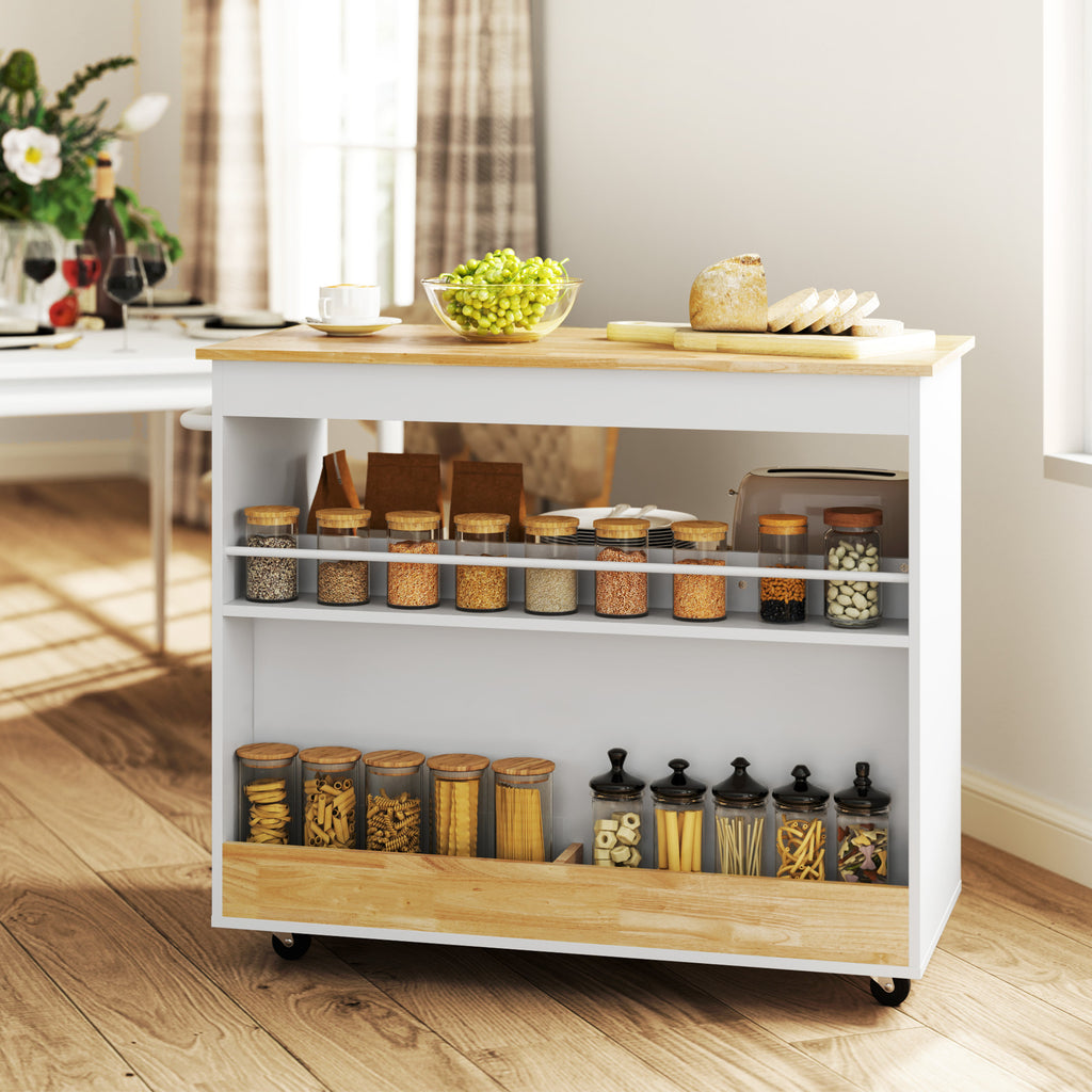 Werten Sie Ihre Küche mit dem Küchenrollwagen von HOMCOM auf. Mit einer eleganten 100 x 50 cm großen Arbeitsplatte aus Gummibaumholz mit lackierter Oberfläche bietet dieser Aufbewahrungswagen ausreichend Platz zum Zubereiten von Speisen und ist gleichzeitig leicht zu reinigen. Mit zwei Schubladen, einem Schrank mit sanft schließender Tür und vier Fächern haben Sie alles Wichtige immer griffbereit und können dank der vier Universalrollen problemlos mobil sein. Ideal für jeden Hobbykoch.