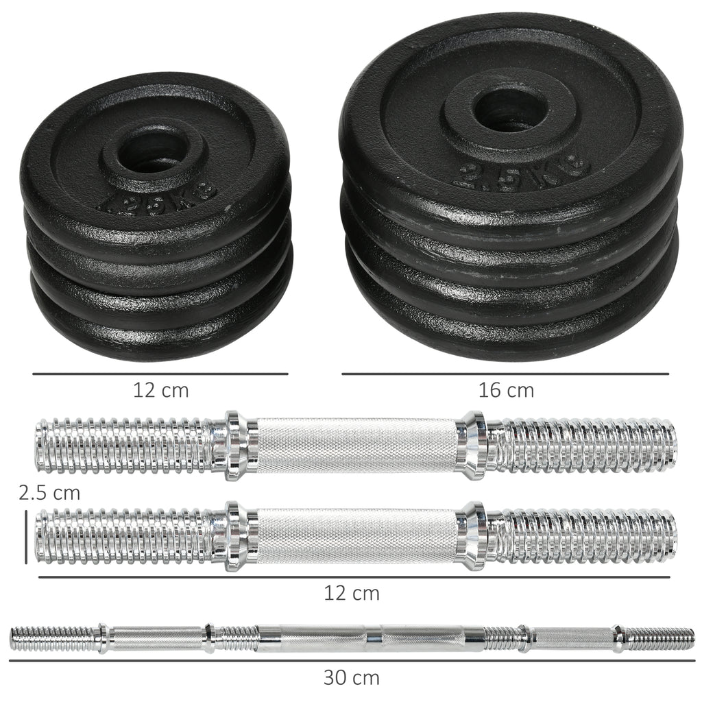 Trainieren Sie effektiv und bequem wie im Fitnessstudio, ohne die eigenen vier Wände zu verlassen! Mit diesem praktischen 20 kg-Hantelset von HOMCOM können Sie schnell zwischen Kurz- und Langhantelübungen wechseln, um gezielt Kraft, Ausdauer und Fitness zu trainieren. Insgesamt acht Hantelscheiben (4 x 2,5 kg, 4 x 1,25 kg) geben Ihnen reichlich Spielraum, um unterschiedlichste Übungen durchzuführen, um Gesäß, Bauchmuskeln, Bizeps, Trizeps, Beine und den Oberkörper in Wunschform zu bringen.