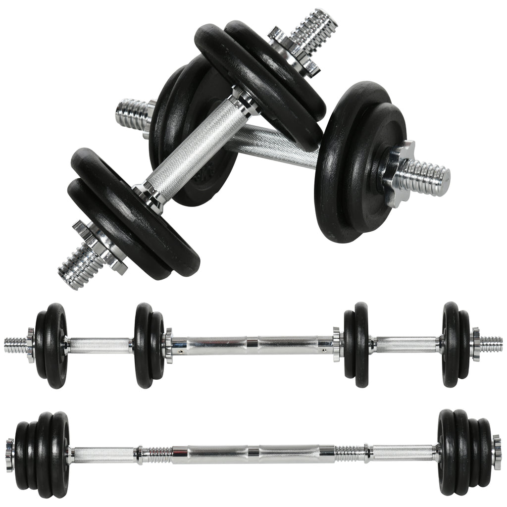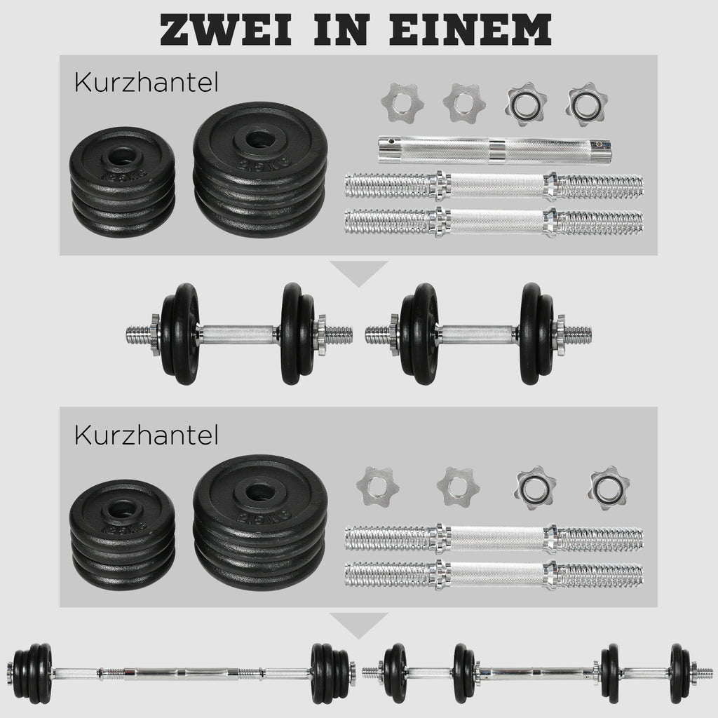 - Zwei Kurzhanteln kombinierbar zu einer Langhantel, insgesamt 20 kg Gewicht