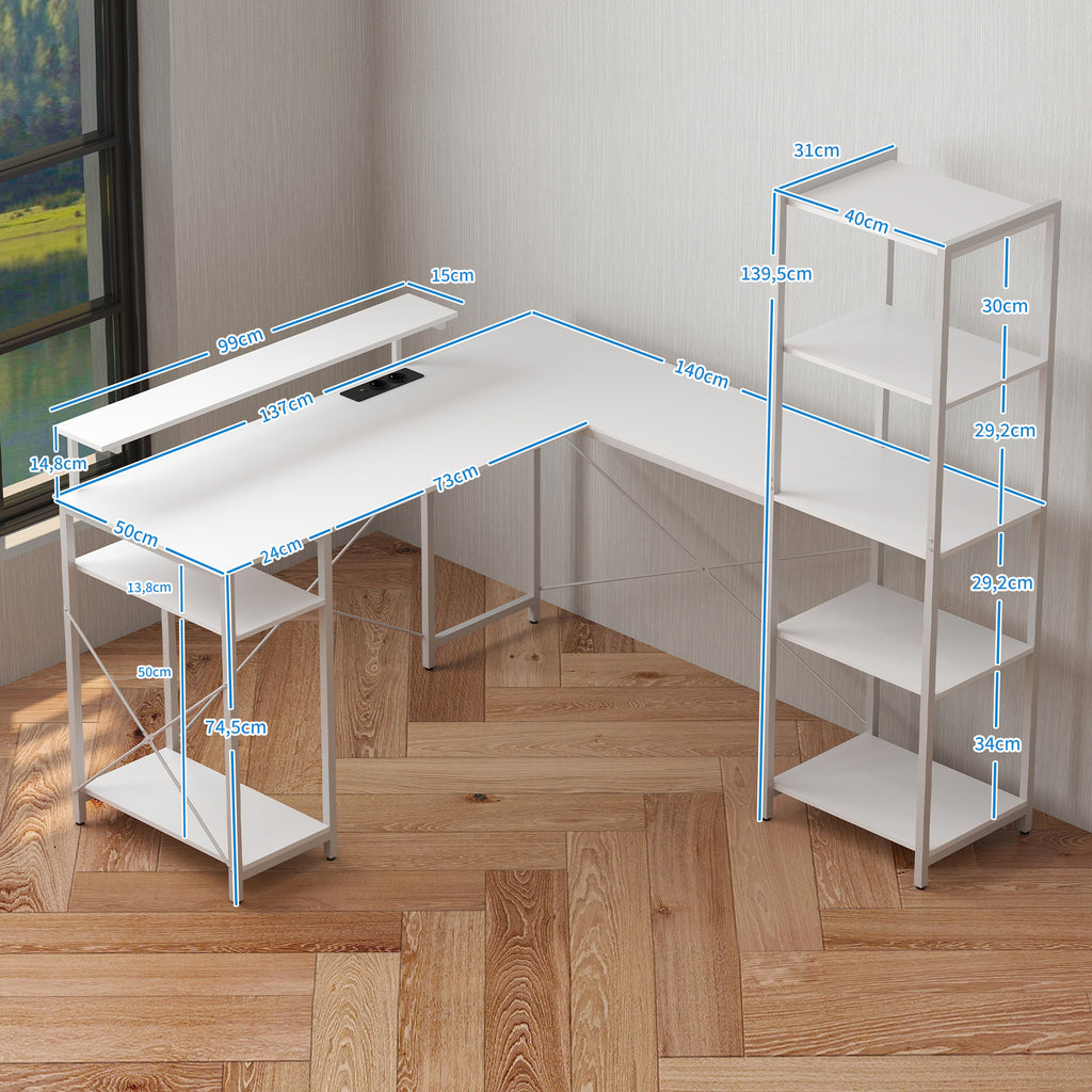 Erleben Sie die Vorzüge des Eckschreibtisches mit Stauraum von HOMCOM: Ein Eckschreibtisch, der Platz spart und mit einer Ladestation ausgestattet ist, inklusive AC-Steckdose, USB-C-Buchse und USB-Port. Der ergonomische Monitorständer des Eckschreibtisches verbessert Ihren Komfort und die integrierten Regale bieten viel Raum für Bücher, Mappen und anderes Zubehör. Ideal für Ihr Homeoffice oder das Büro.