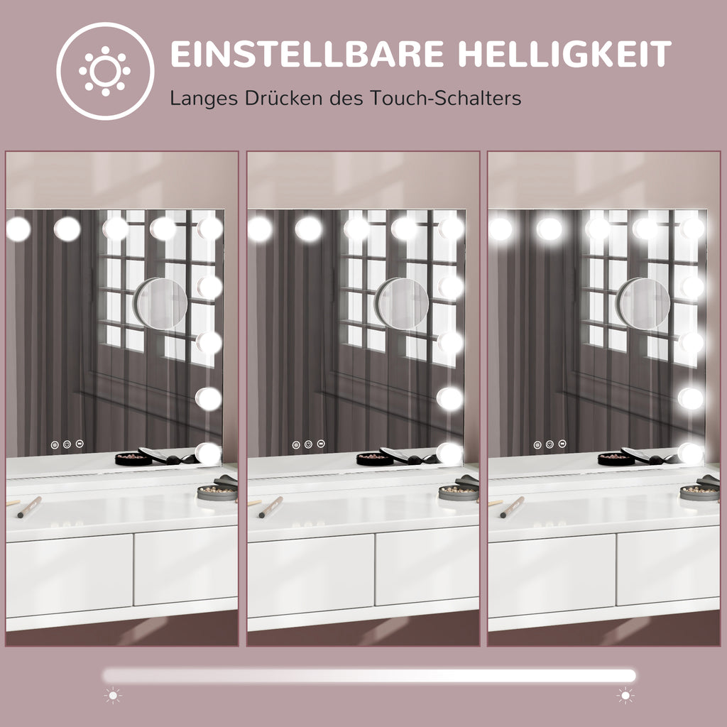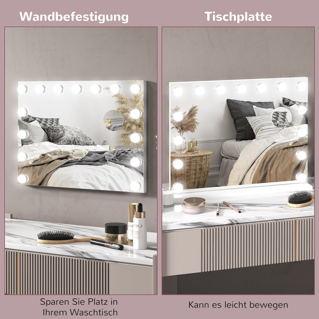 Erleben Sie mit dem HOMCOM LED Kosmetikspiegel einen neuen Winkel der Pflegeroutine. Ideal für jeden Schminktisch, bietet dieser Spiegel mit 15 dimmbaren LED-Lampen, die bis zu 50.000 Stunden leuchten, perfekte Lichtverhältnisse. Werden Sie Ihre eigene Makeup-Influencerin dank drei einstellbarer Lichtmodi und variabler Helligkeit. Zusätzlich hält der praktische USB-Anschluss Ihre Geräte stets aufgeladen. Ein Muss für jede Beauty-Routine!