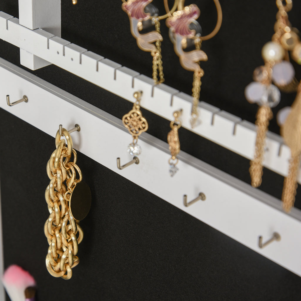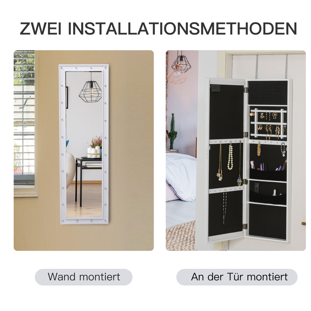 Dieser elegante Schmuckschrank von HOMCOM ist perfekt zum Organisieren und Aufbewahren Ihrer Lieblingsringe, Halsketten, Armbänder, Kosmetika und anderen Accessoires. Er ist mit 24 LED-Birnen um den Türrahmen herum ausgestattet, um Ihnen helles Licht zu bieten, wenn Sie sich verkleiden. Mit diesem stilvollen und funktionellen Gadget können Sie Ihren Schmuck auswählen und sich morgens ganz einfach schminken, ohne frustriert nach fehlenden Stücken suchen zu müssen!