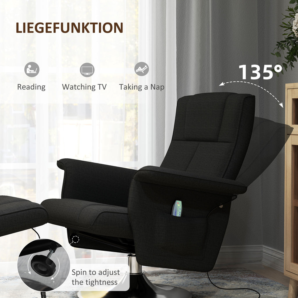 Nach einem anstrengenden Tag können Sie sich zurücklehnen, entspannen und in diesem HOMCOM Relaxsessel mit Liegefunktion eine angenehme Massage genießen. Die Massagepunkte verwöhnen Ihren Rücken, Ihre Lendenwirbelsäule, Oberschenkel und Beine. Sie haben die Wahl zwischen der automatischen Massagefunktion für vorprogrammierte Massagen oder der manuellen Auswahl verschiedener Massagebereiche nach Ihren Wünschen. Dieses Set, bestehend aus dem Relaxsessel und der Ottomane, bietet Ihnen auf Knopfdruck Entspannung und lädt zum Ausruhen und Verweilen ein.