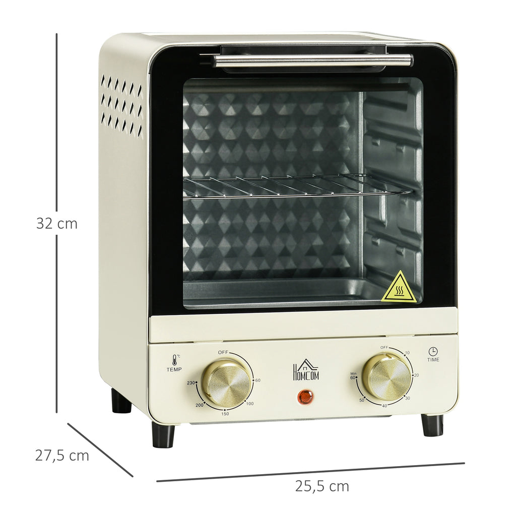 Möchten Sie zu Hause leckeres Essen für Ihre Familie zubereiten? Warum wählen Sie dann nicht einen Mini Ofen von HOMCOM? Dank der einstellbaren Temperatur, der Garzeit und der großen Leistung (1000W) können Sie ganz einfach unterschiedliche Speisen damit zubereiten. 4 Einschübe, 1 Gitterrost und 1 Backblech sind im Lieferumfang enthalten. Das große Fassungsvermögen von 15 Litern bietet Platz für 4 Scheiben Brot oder eine 10''Pizza für die ganze Familie. Das integrierte Krümelfach sorgt dabei für eine einfache Reinigung. Zögern Sie nicht und nehmen Sie ihn mit nach Hause!