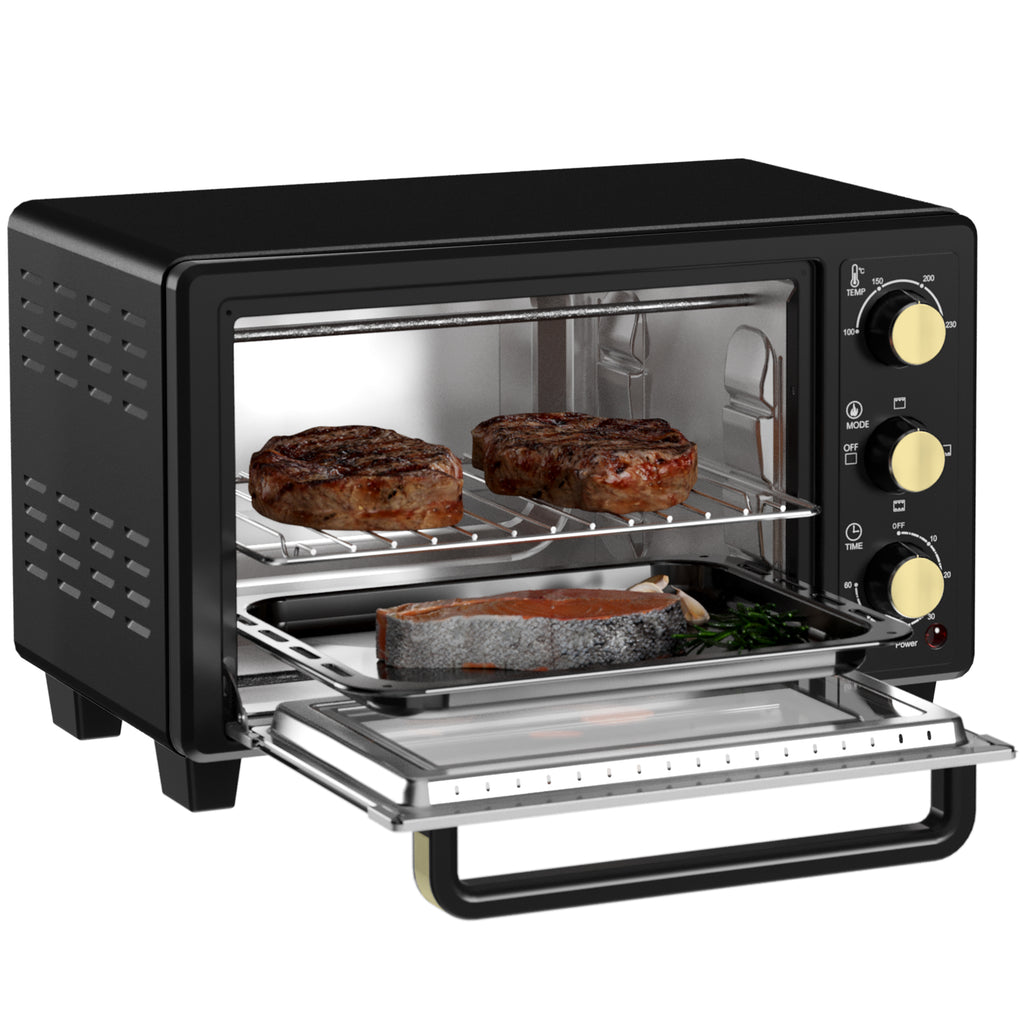 Mit diesem HOMCOM Miniofen können Sie unabhängig von Raumgröße oder -beschaffenheit einfach diverse Gerichte zubereiten. Er wird mit einem herausnehmbaren Gitterrost und Backblech geliefert, das sich auf drei Ebenen einstellen lassen. Die Temperaturregelung des Mini Backofens von 100°C bis 230°C verhindert das Verbrennen von Speisen. Dank des 60 Min. Timers schaltet sich der Ofen automatisch ab, auch wenn Sie nicht im Raum sind. Inklusive eines Blechgriffs, um heiße Oberflächen zu meiden.
