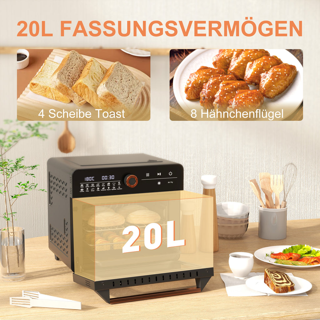 Das retro-angehauchte Design dieses Mini-Backofens bringt nostalgischen Charme in Ihre Küche, kombiniert mit moderner Technik. Die Temperatur lässt sich mühelos zwischen 40 und 220° C einstellen. Mit 17 voreingestellten Programmen – von Toast, Auftauen, Backen, über Hähnchen, Chickenwings, Steak, Fisch, Pizza, Kekse, Pommes, Brot, Kuchen, Popcorn, Gemüse, Warmhalten bis hin zur Luftfritteuse – bietet dieser kleine Backofen vielseitige Kochmöglichkeiten für jeden Anlass.