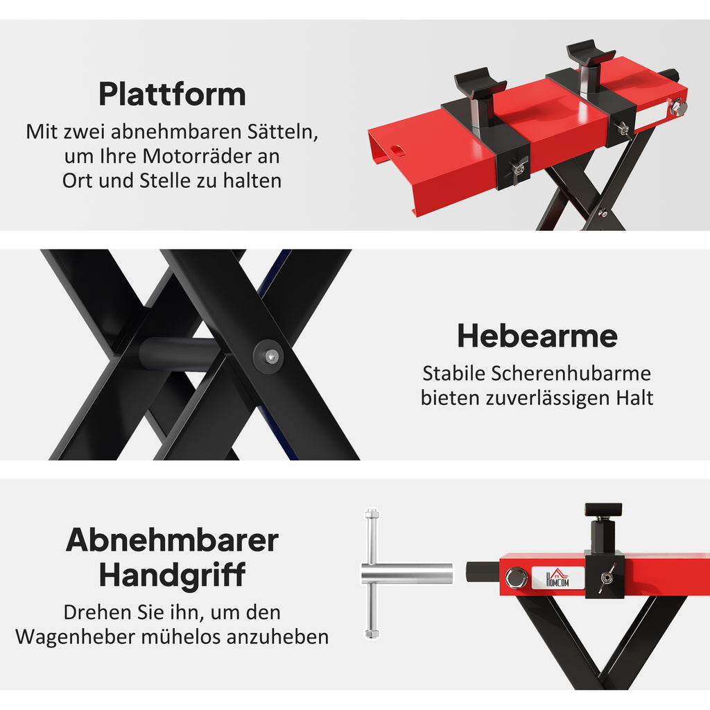 Optimieren Sie die Wartung Ihres Motorrads mit dem HOMCOM Motorrad-Gelenkwagenheber! Der Motorrad-Hebebock trägt bis zu 500 kg und lässt sich von 9,5 cm auf beeindruckende 40 cm erhöhen, passend für die meisten Motorräder. Die solide Stahlschere der Motorradhebebühne mit abnehmbaren Stützsätteln garantiert eine stabile und sichere Position Ihres Bikes. Heben Sie es leicht mit dem abnehmbaren Griff an. Perfekt für Reinigungsarbeiten und Reparaturen!